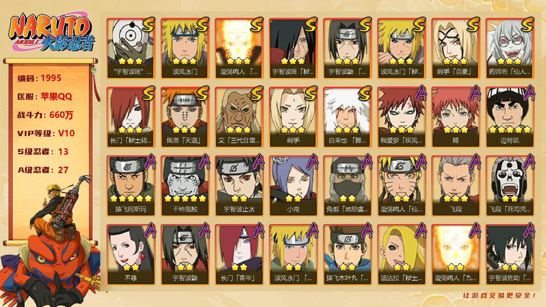 火影忍者【苹果QQ】V10 660万战力 13S-27A 忍战樱57片 九喇嘛水门52片 日斩57