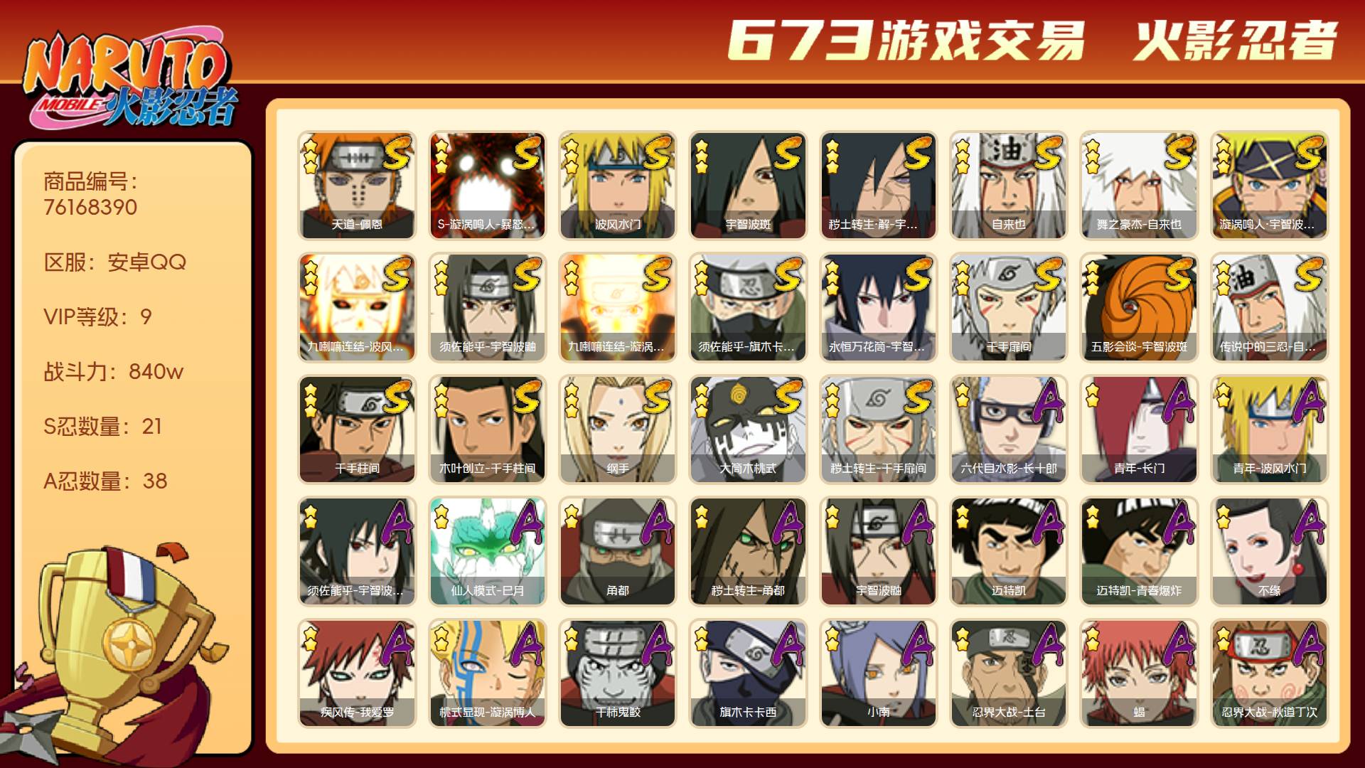 7s准8s,720w战力,金水,老三代,仙人兜,五影斑,百豪纲57片,有二次,有熊猫,10000金币