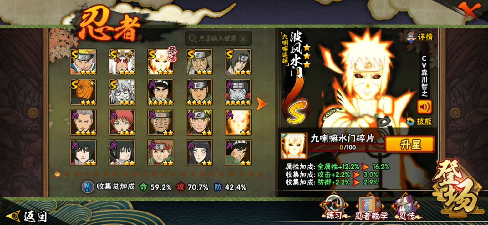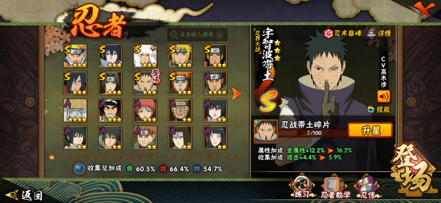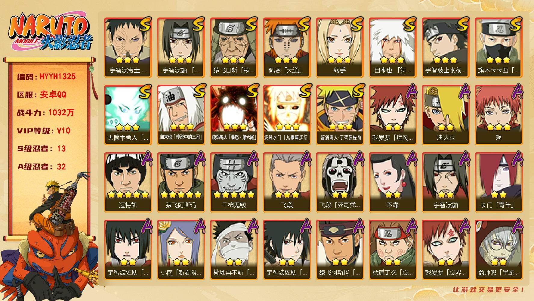 V10/战力1032W/S忍13/A忍32/2星宇智波带土