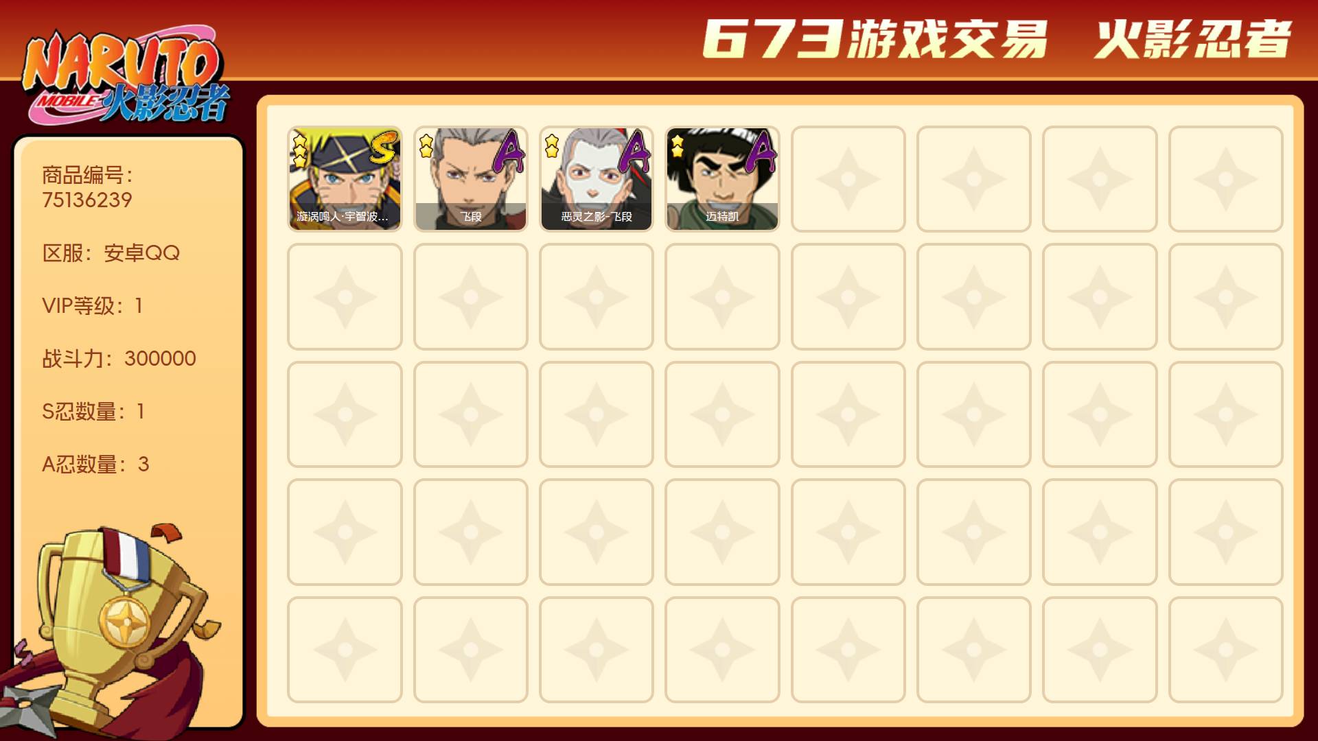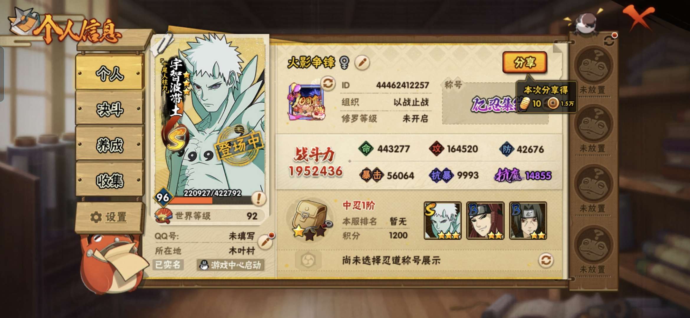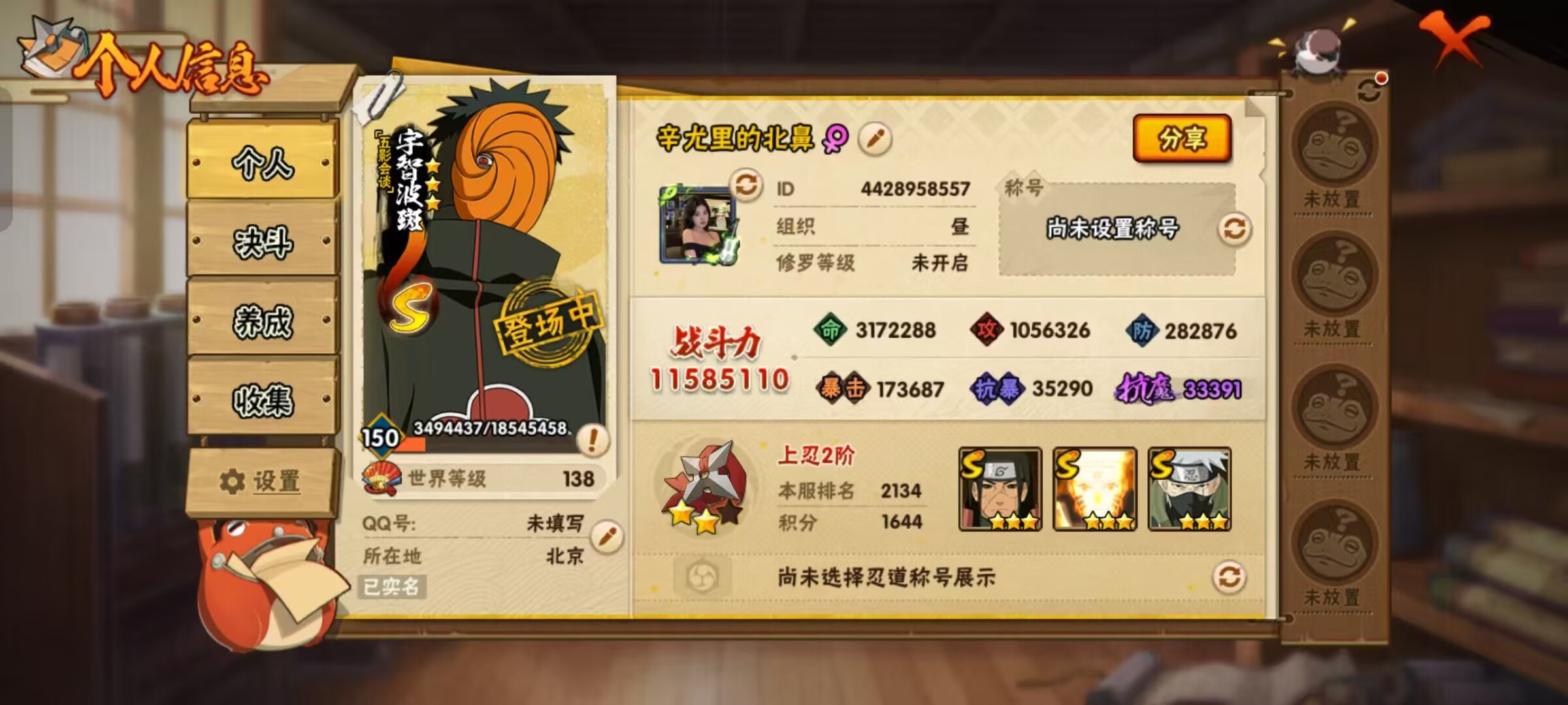 角色等级56 金币999 战斗力300000 S忍1 A忍3 1 段位暗部
