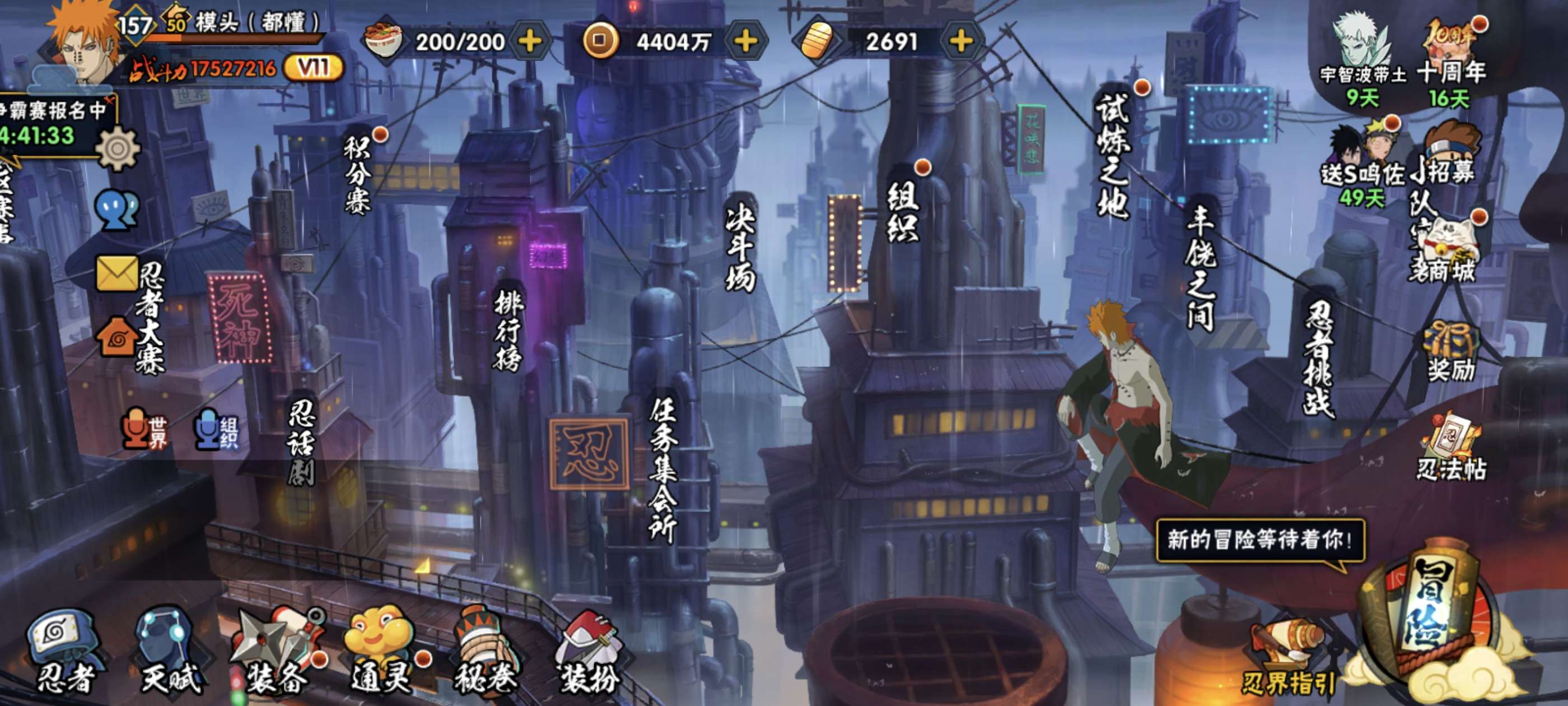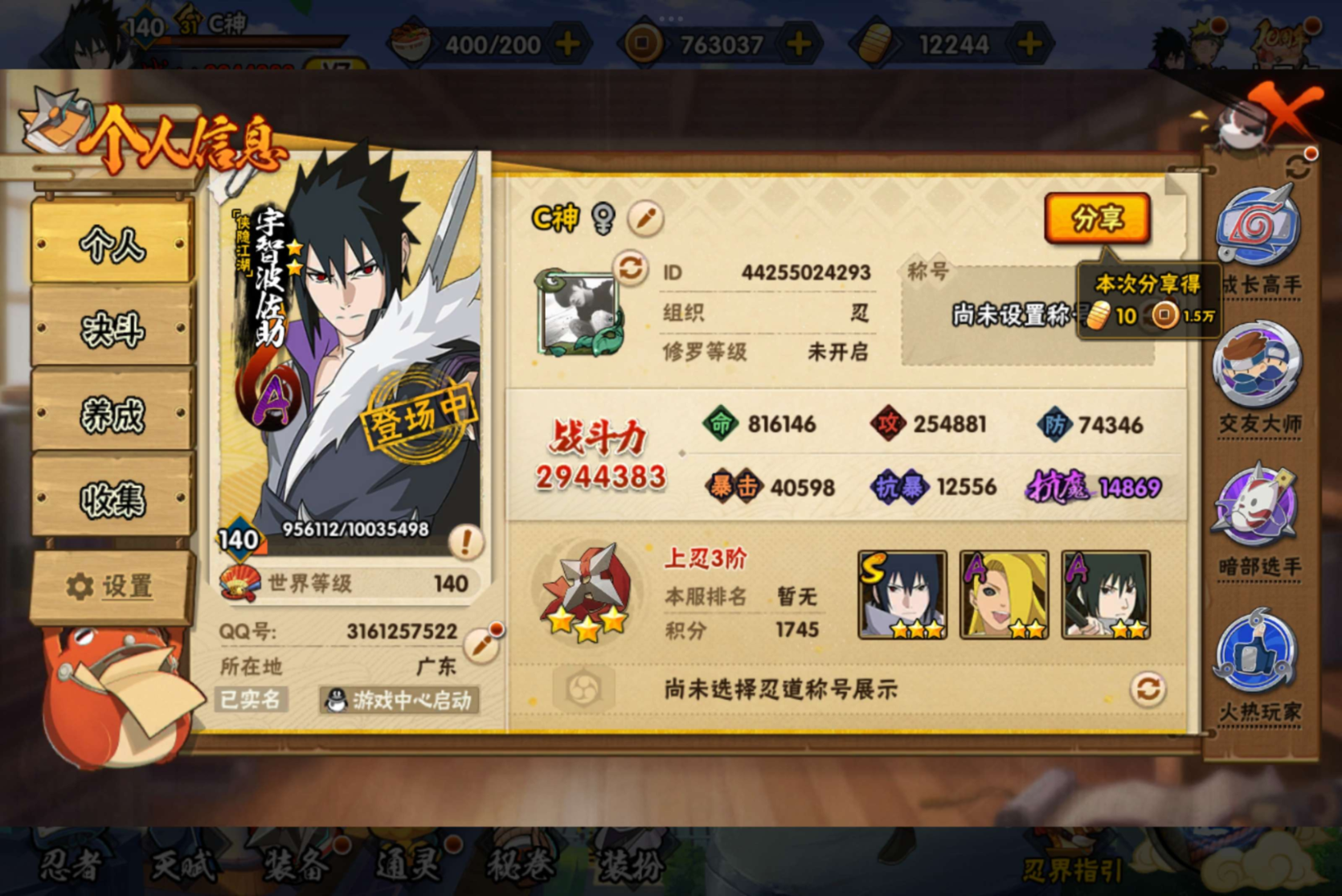 角色等级149 金币300 战斗力11700000 S忍24 A忍45 5星S忍者20 10 段位超