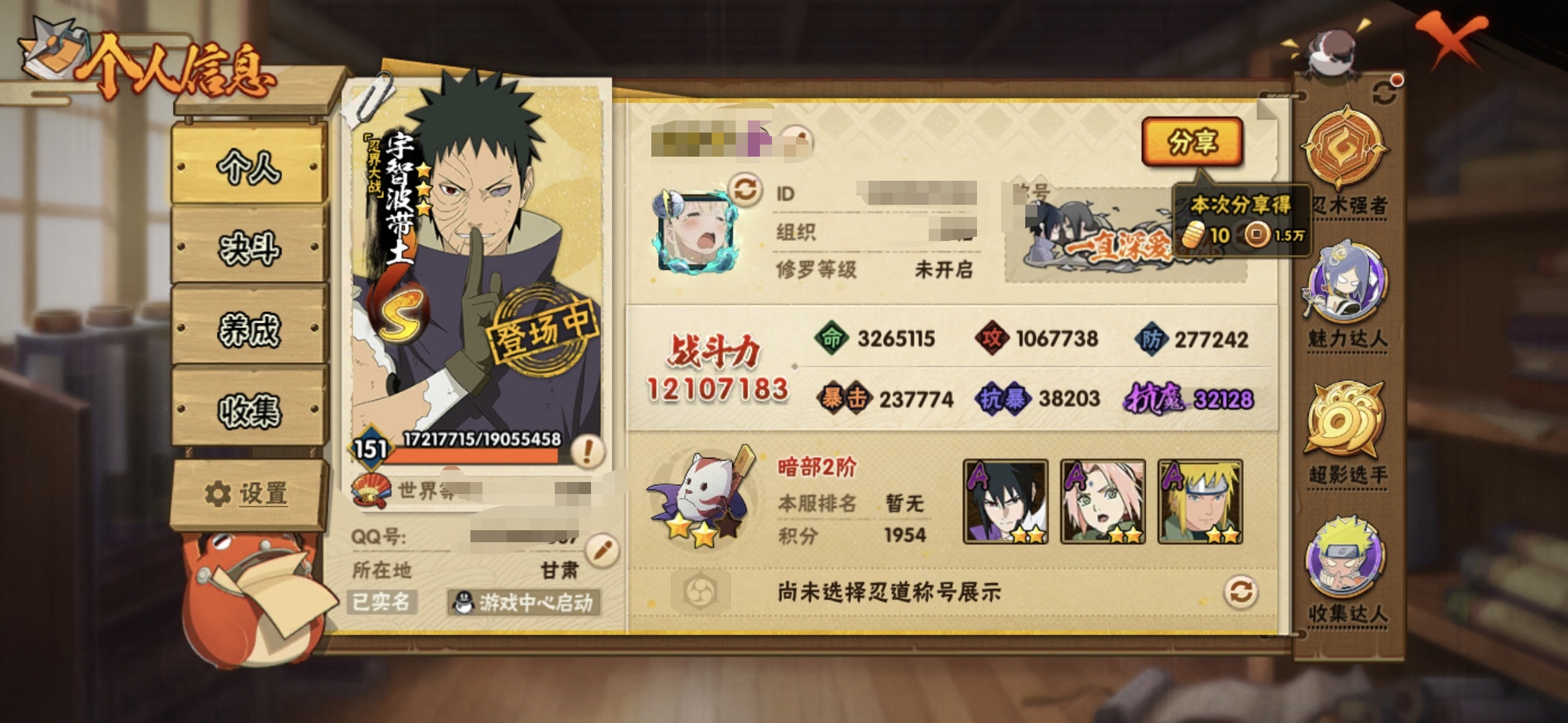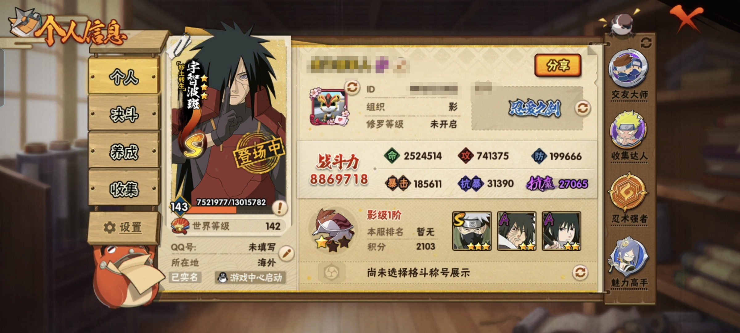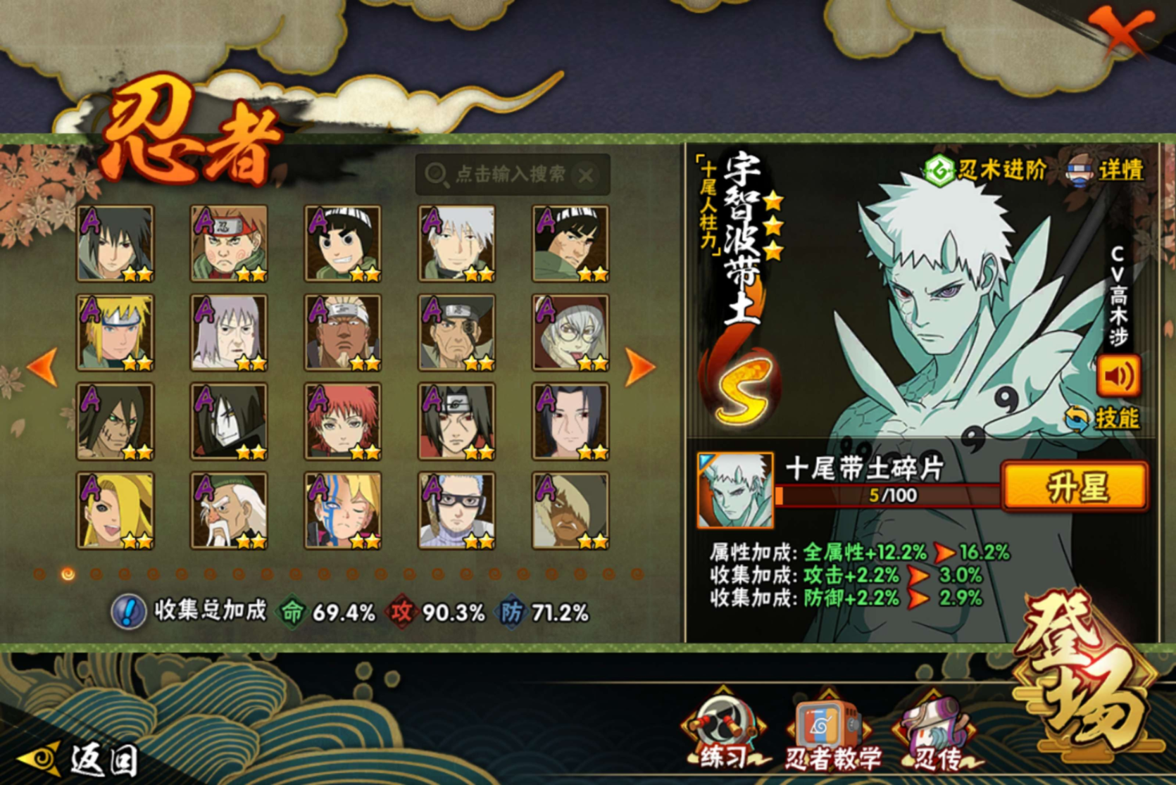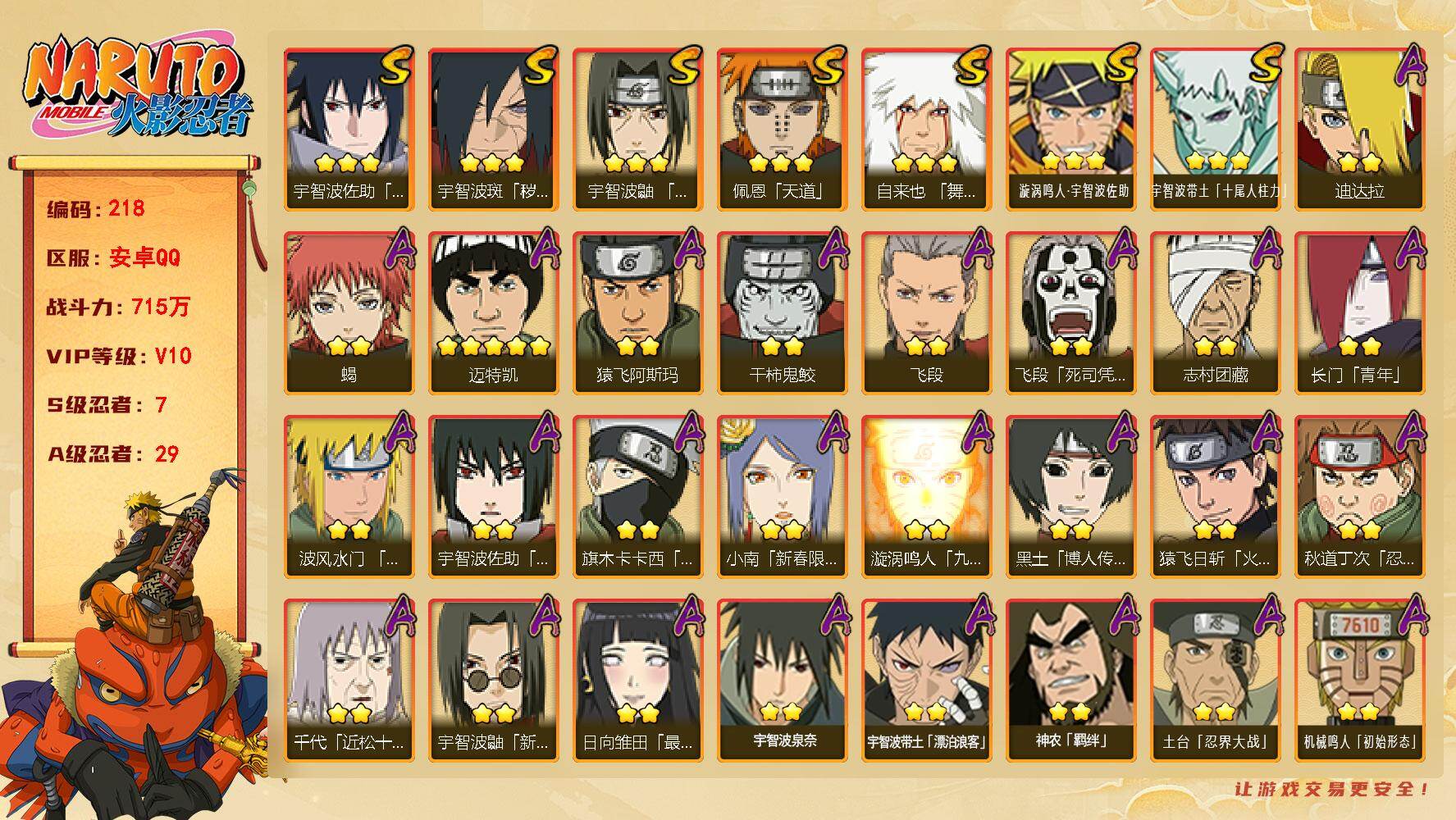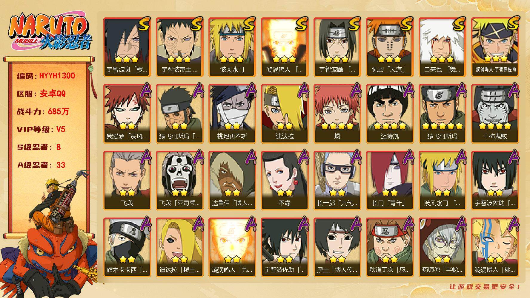 5/战力685W/S忍8/A忍33/4星干柿鬼鲛/2星大野