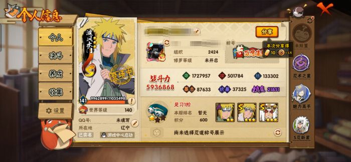 角色等级136 战斗力4300000 S忍13 A忍30 10 段位上忍