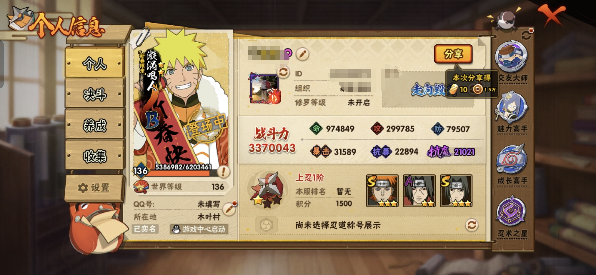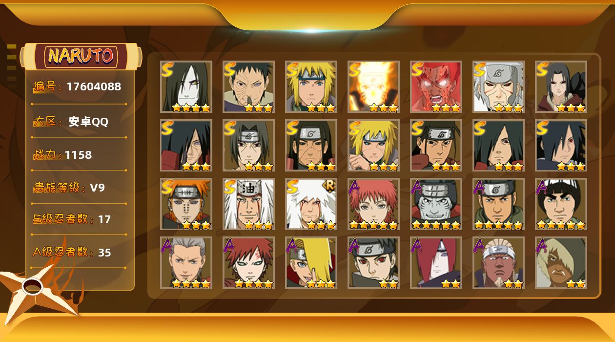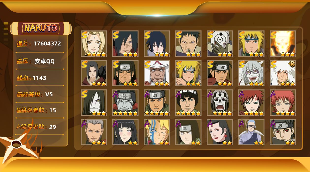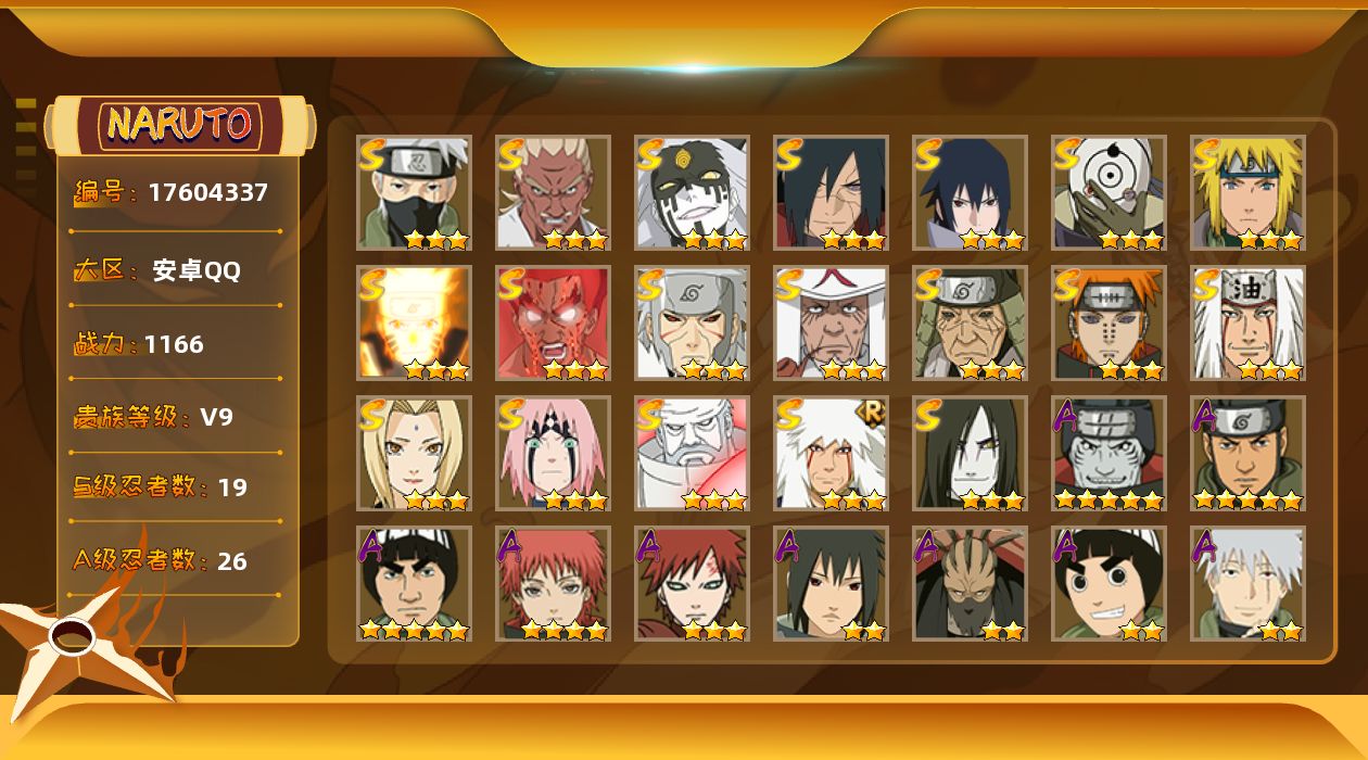 角色等级100 金币150 战斗力1900000 S忍4 A忍9 4 段位中忍