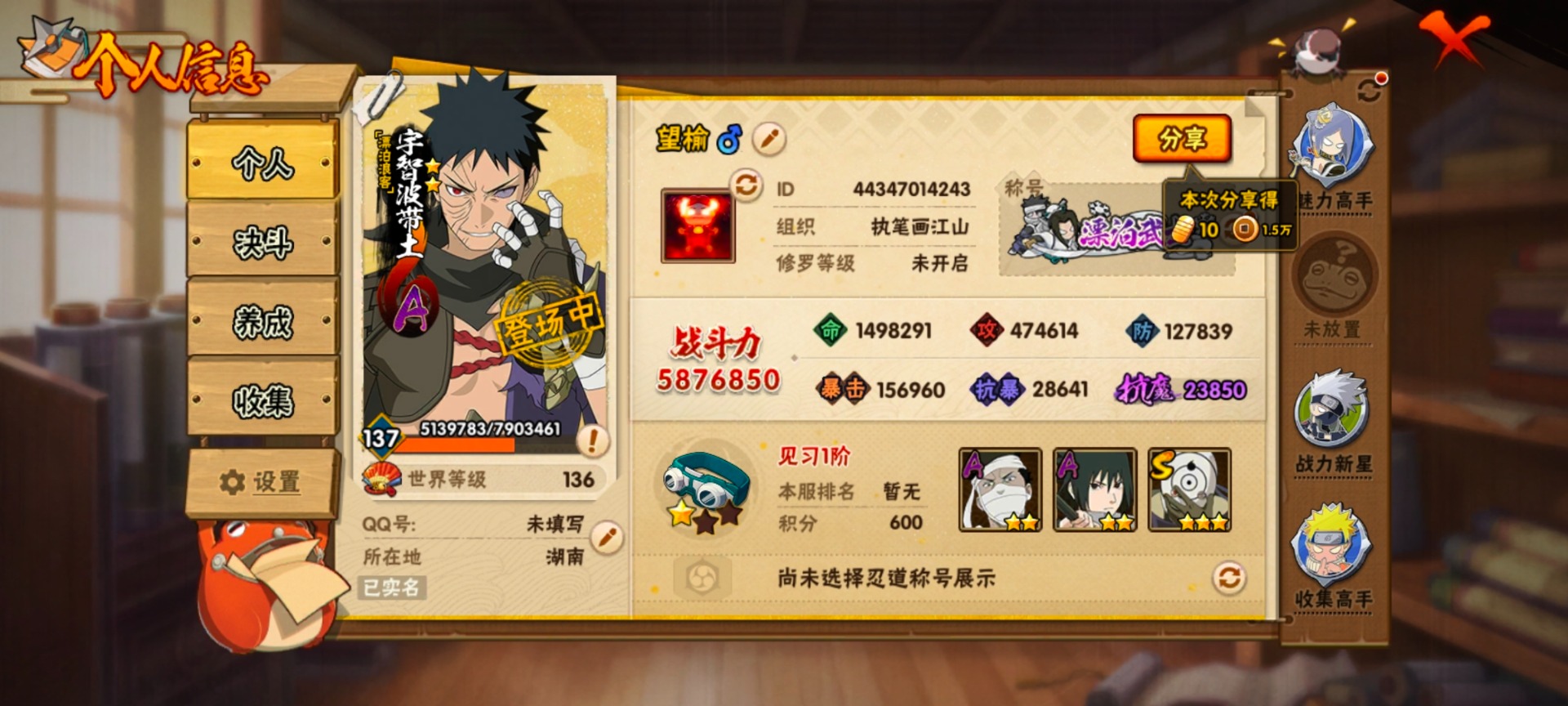 角色等级130 金币1500 战斗力220万 S忍6 A忍13 1