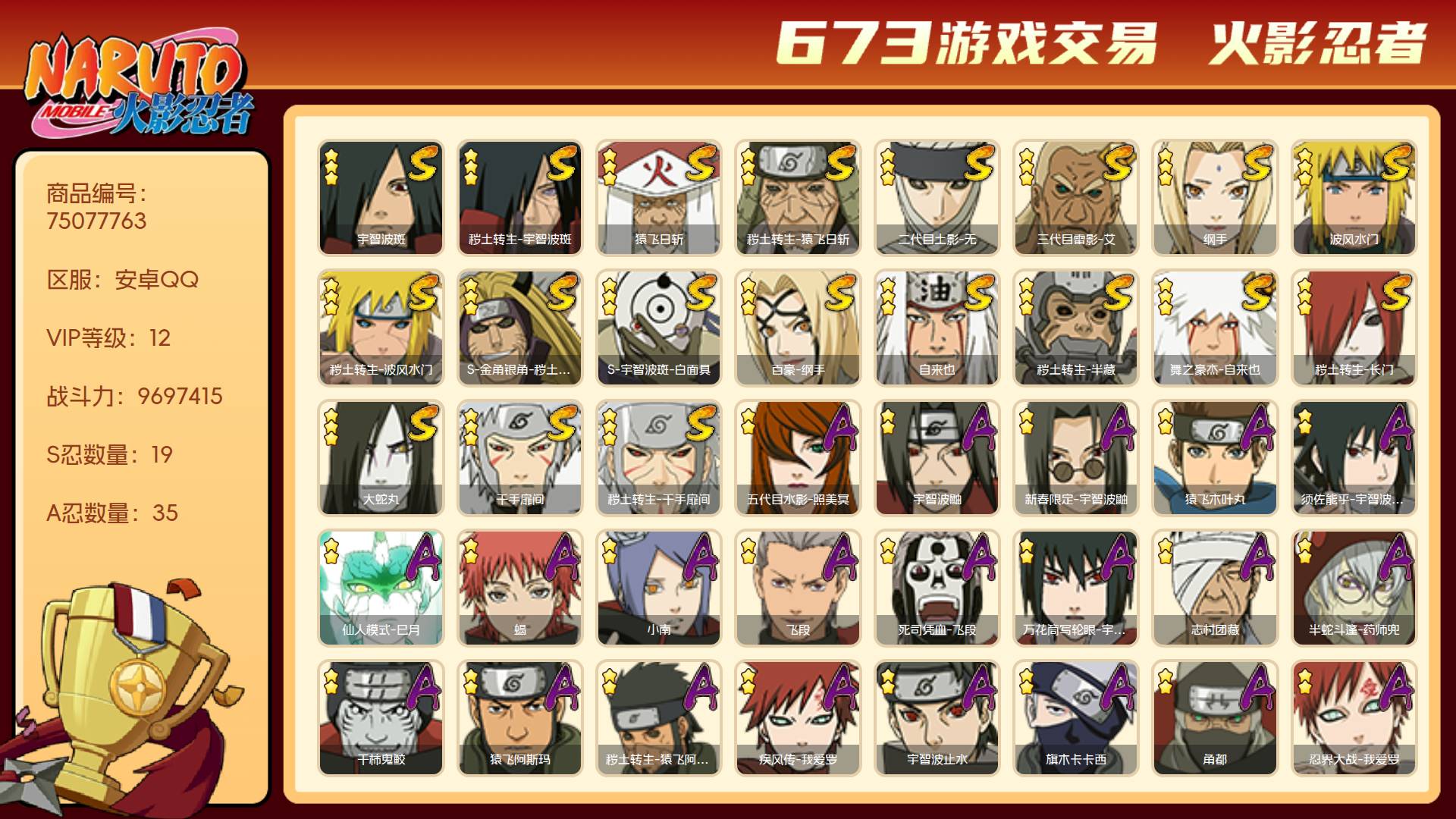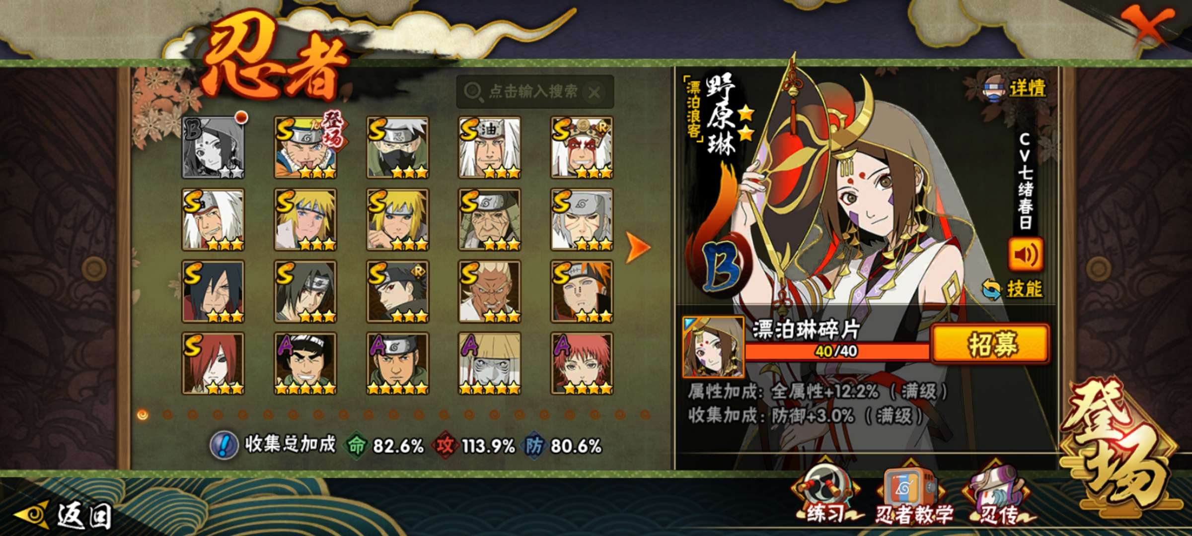 角色等级144 战斗力9697415 S忍19 A忍35 5星S忍者15 12