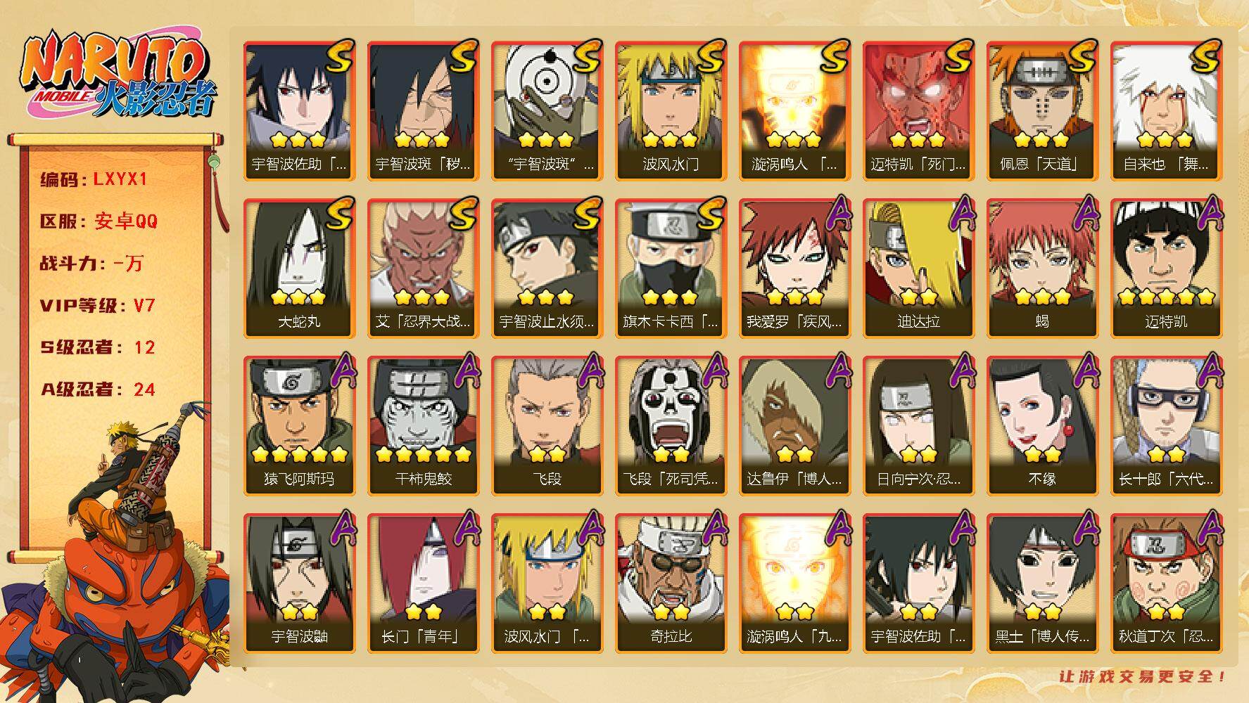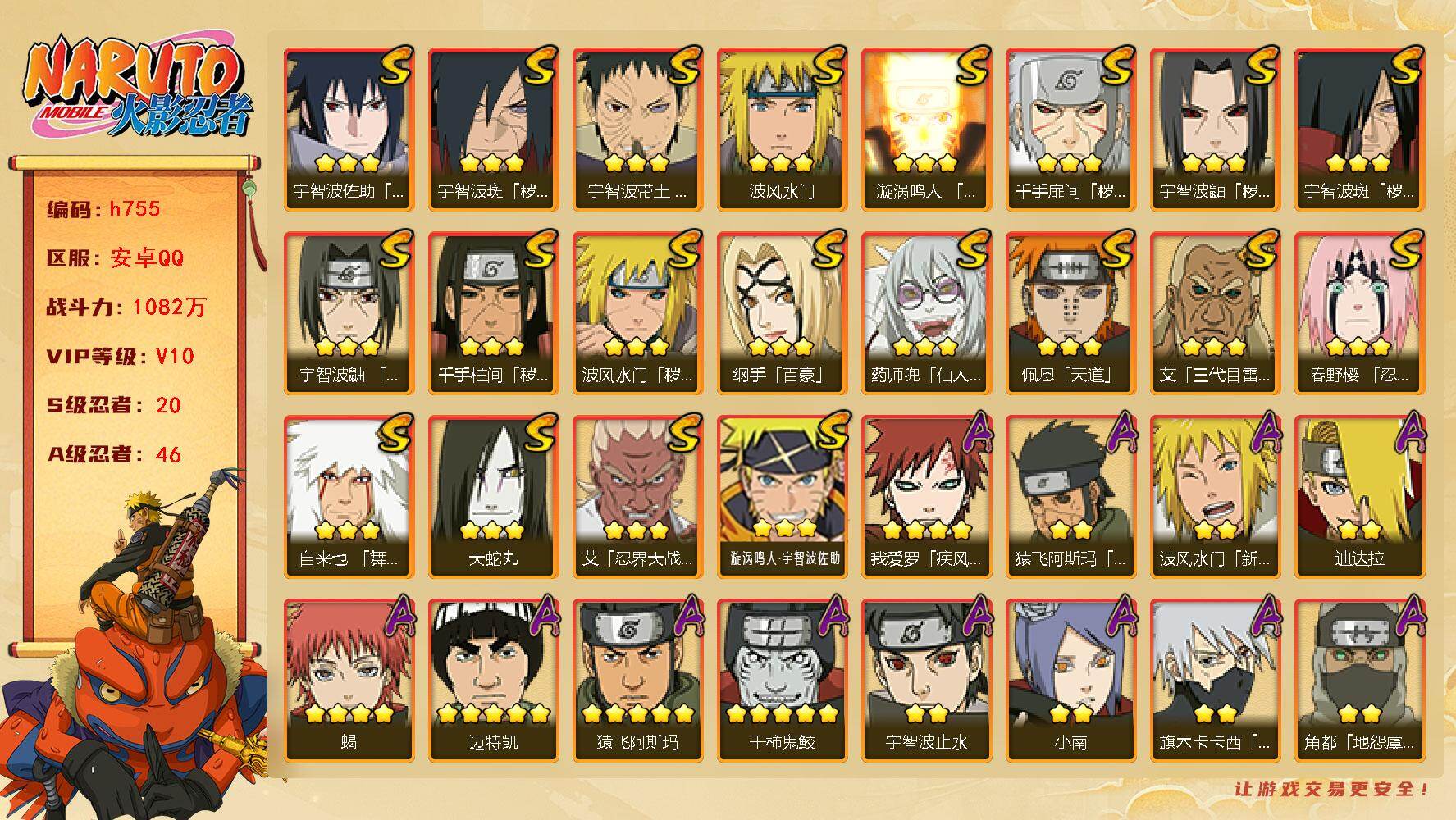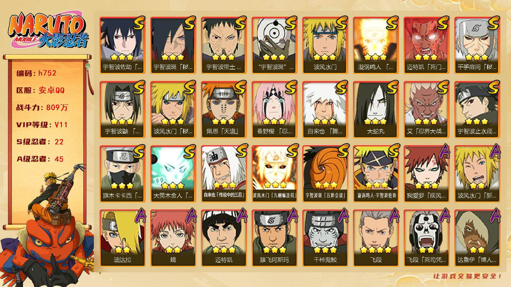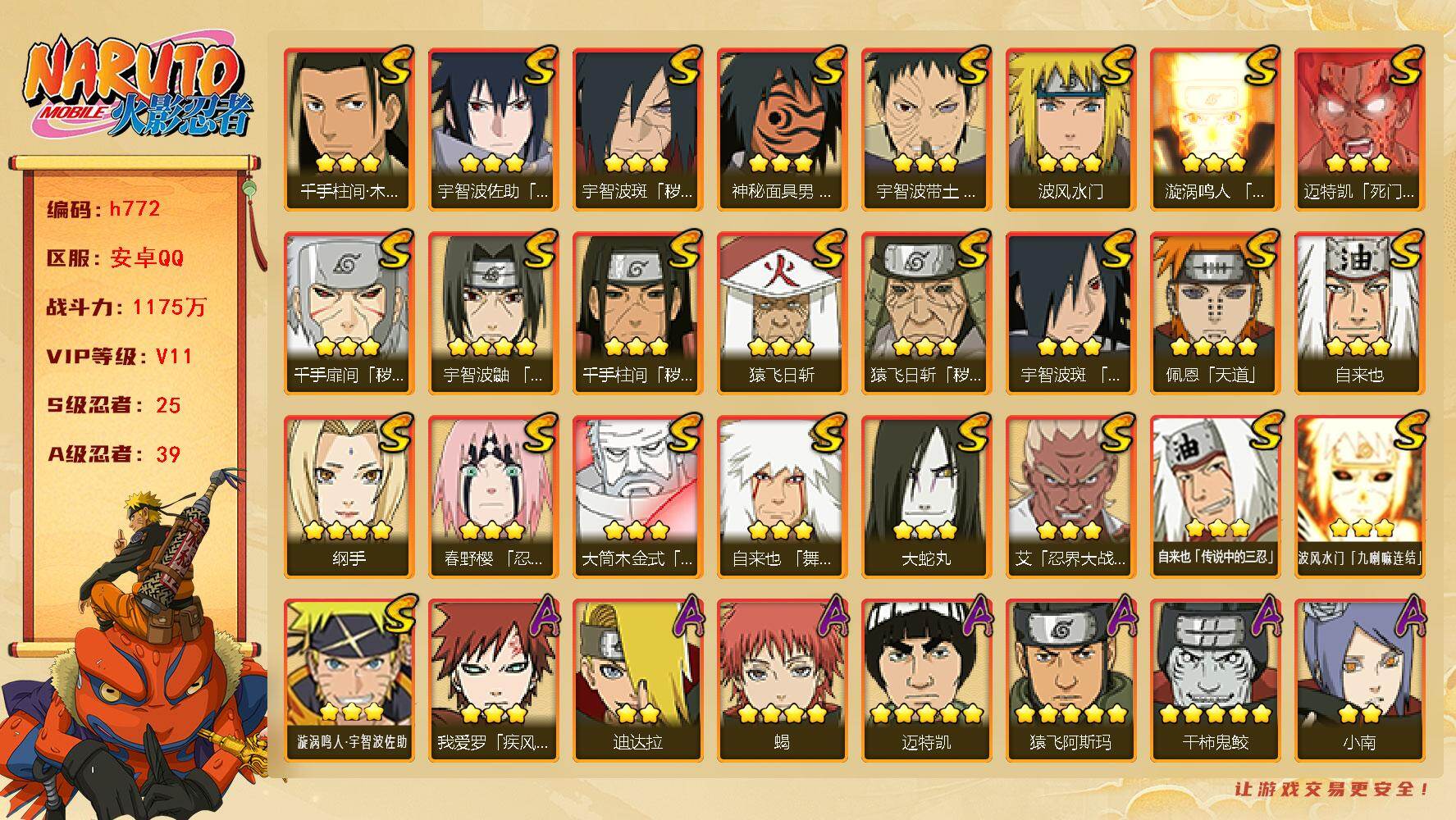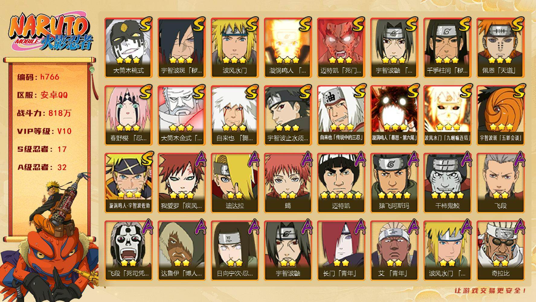 6S忍/10A忍/战力175W/V1/区服2222 【S忍者】漩涡鸣人「九喇嘛连结」,自来也「舞之豪杰」,宇智波鼬「须佐能乎」,佩恩「天道」,波风水门,大蛇丸,【A忍者】
