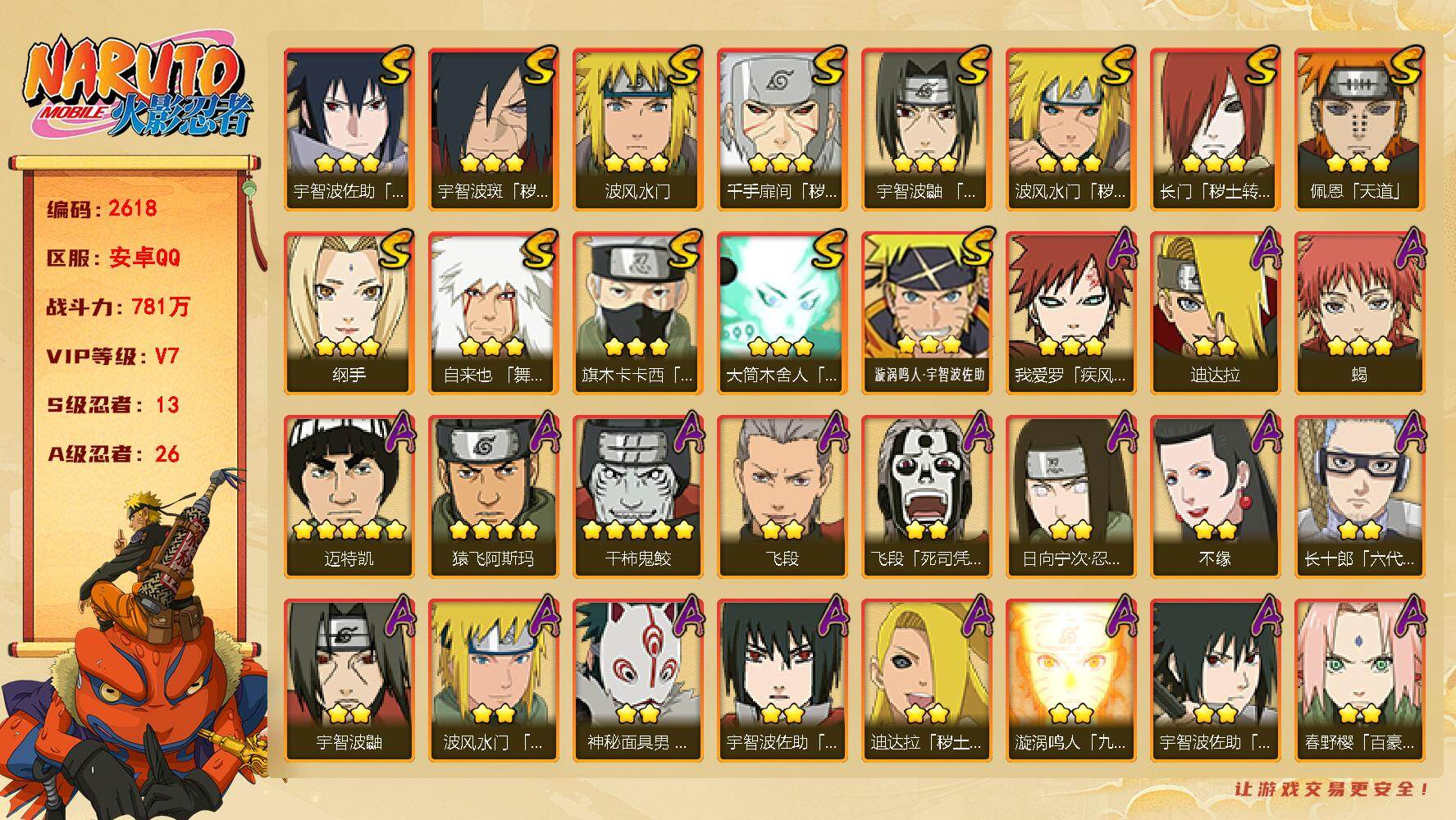 6S忍/16A忍/战力290W/V3/区服2581 【S忍者】宇智波佐助「漩涡鸣人」,漩涡鸣人「九喇嘛连结」,自来也「舞之豪杰」,宇智波鼬「须佐能乎」,佩恩「天道