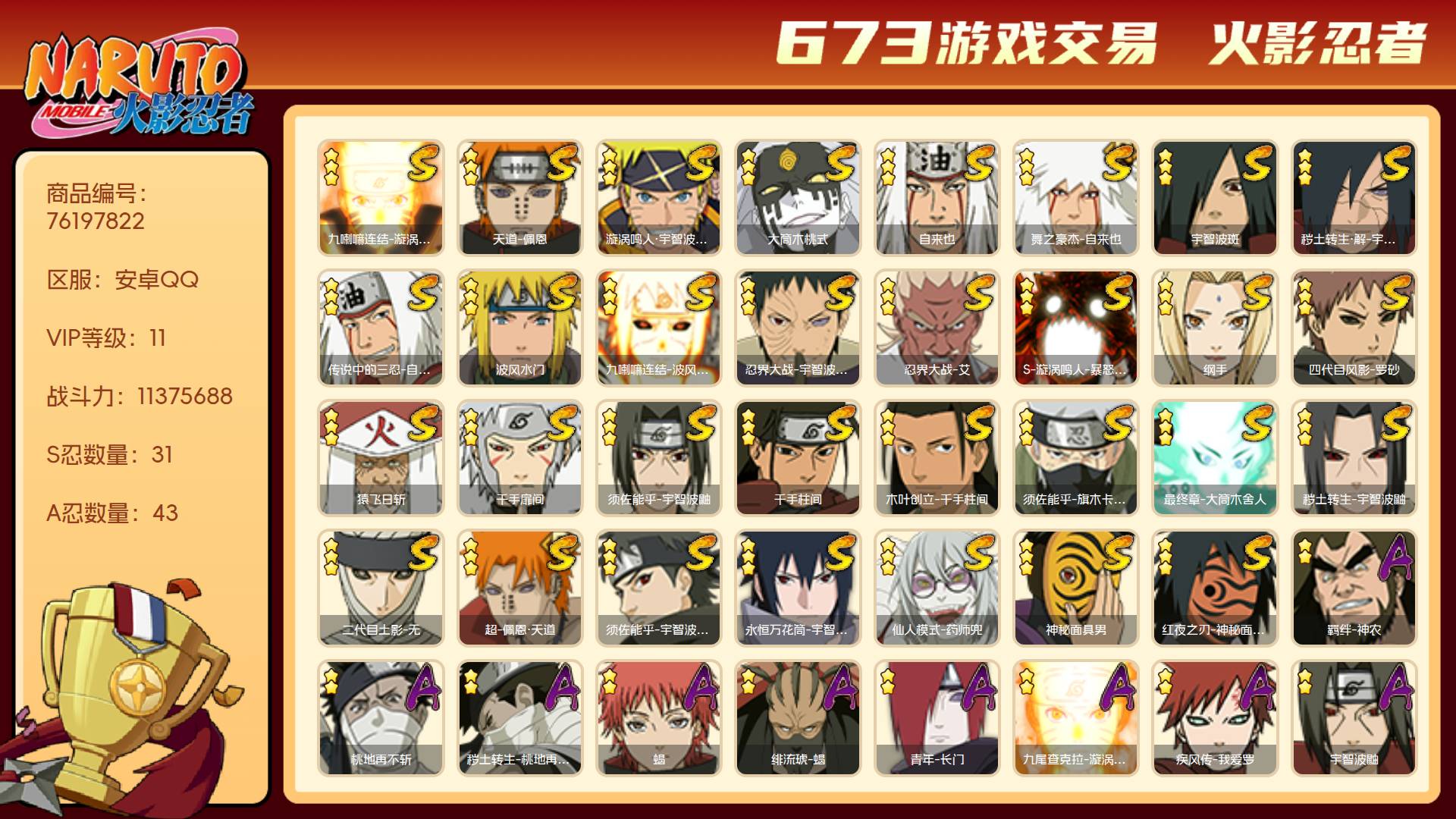 6S忍/15A忍/战力253W/区服3072 【S忍者】宇智波佐助「漩涡鸣人」,自来也「舞之豪杰」,宇智波鼬「须佐能乎」,佩恩「天道」,波风水门,大蛇丸,【A忍者】纲手