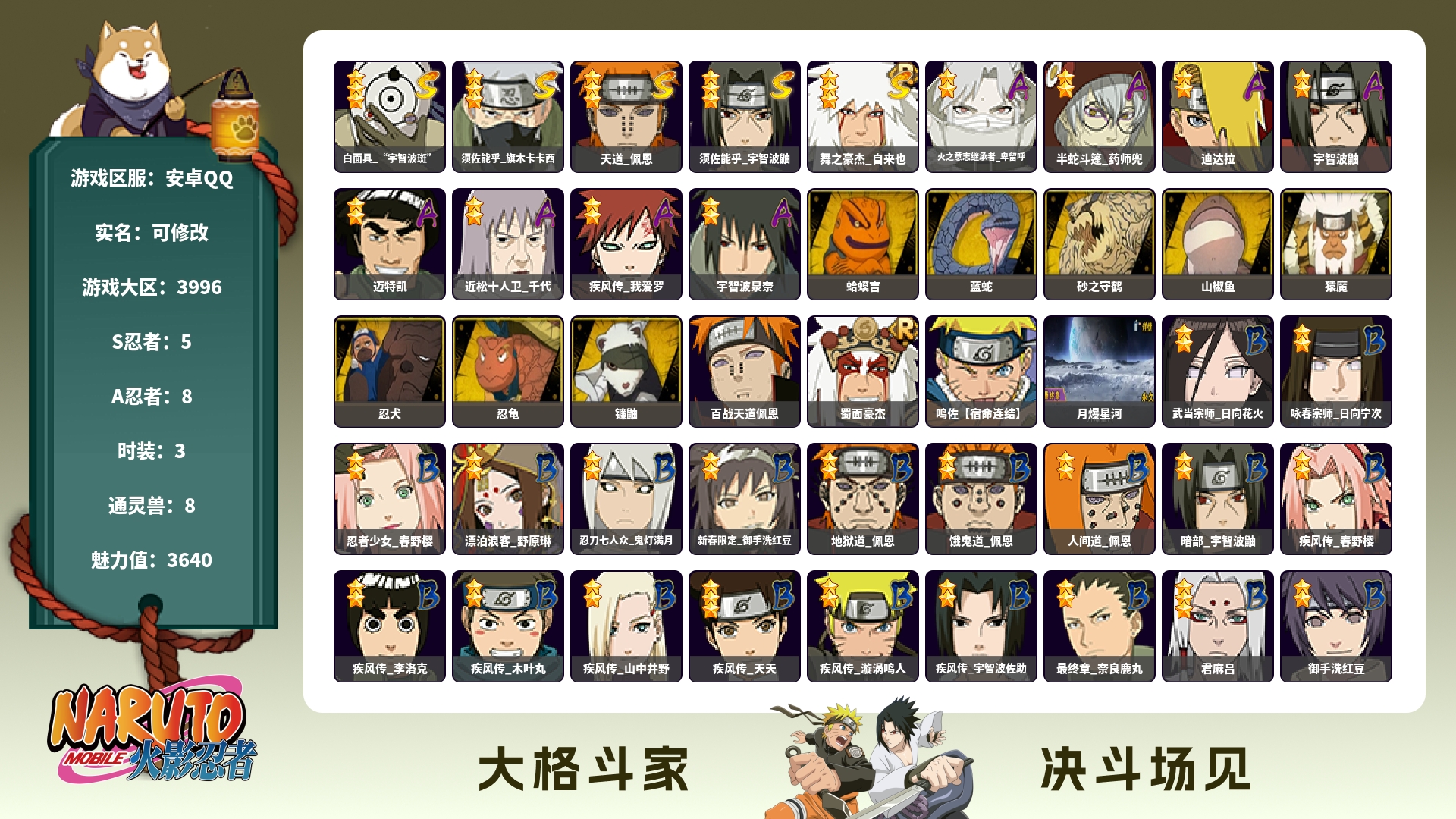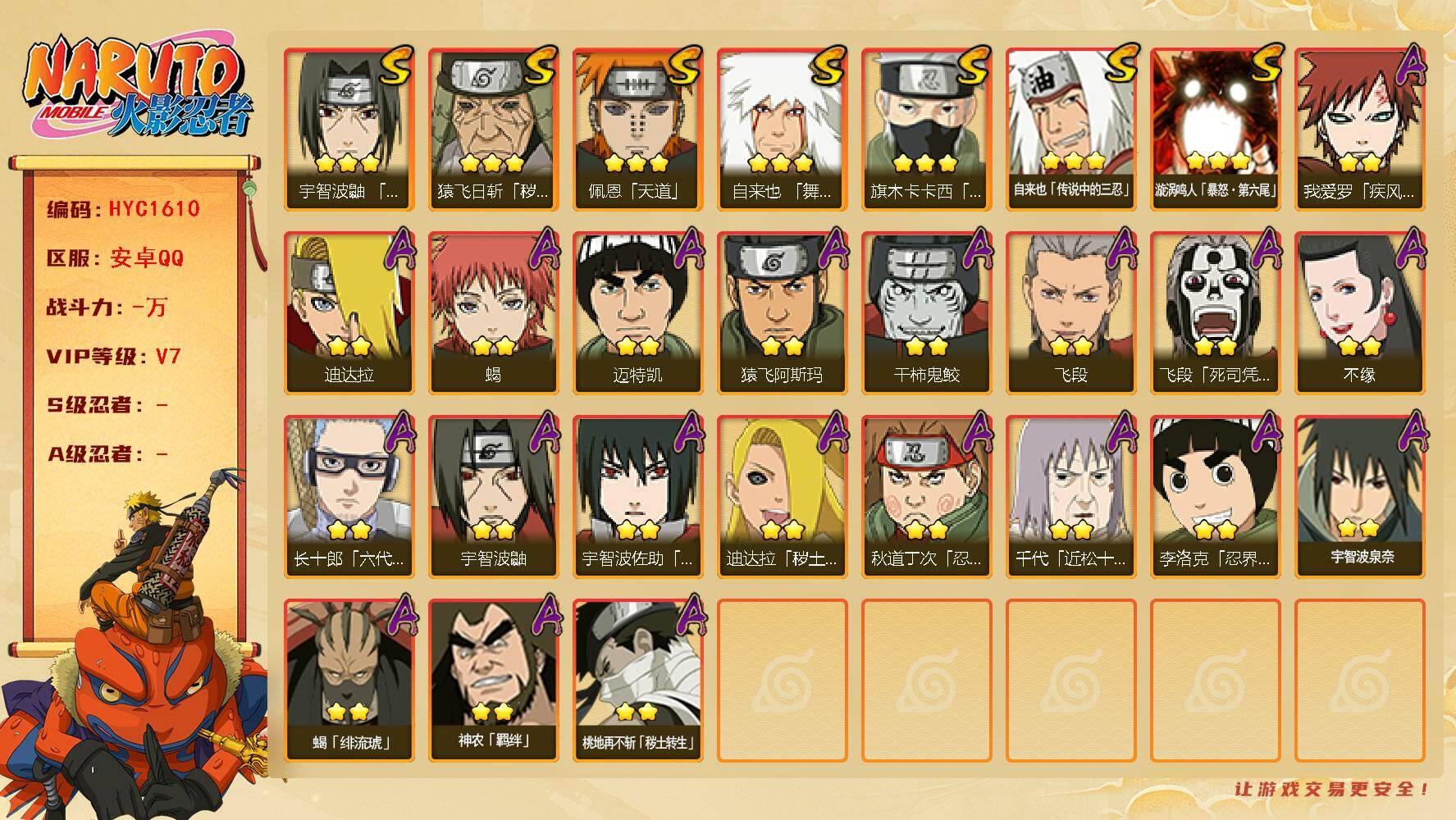 7S忍/20A忍/战力330W/V5/区服3099 【S忍者】宇智波佐助「漩涡鸣人」,宇智波佐助「永恒万花筒」,漩涡鸣人「九喇嘛连结」,自来也「舞之豪杰