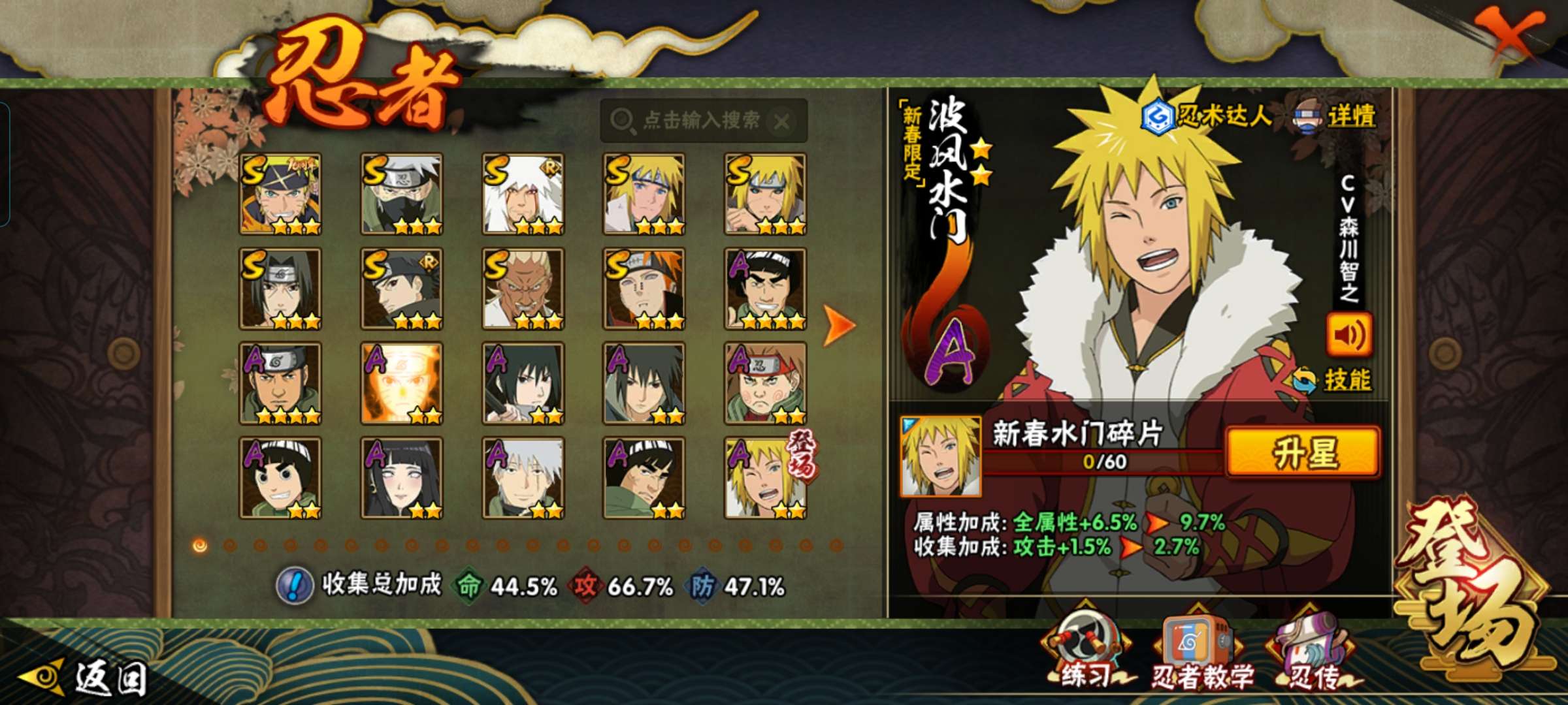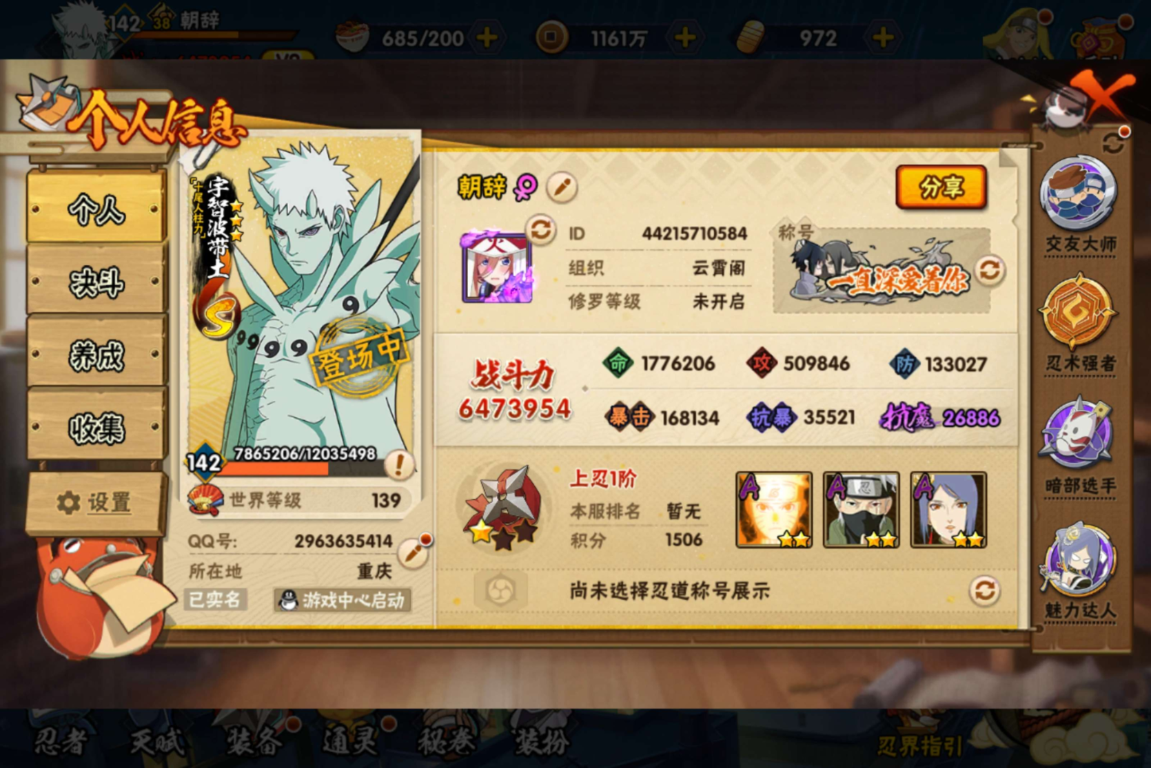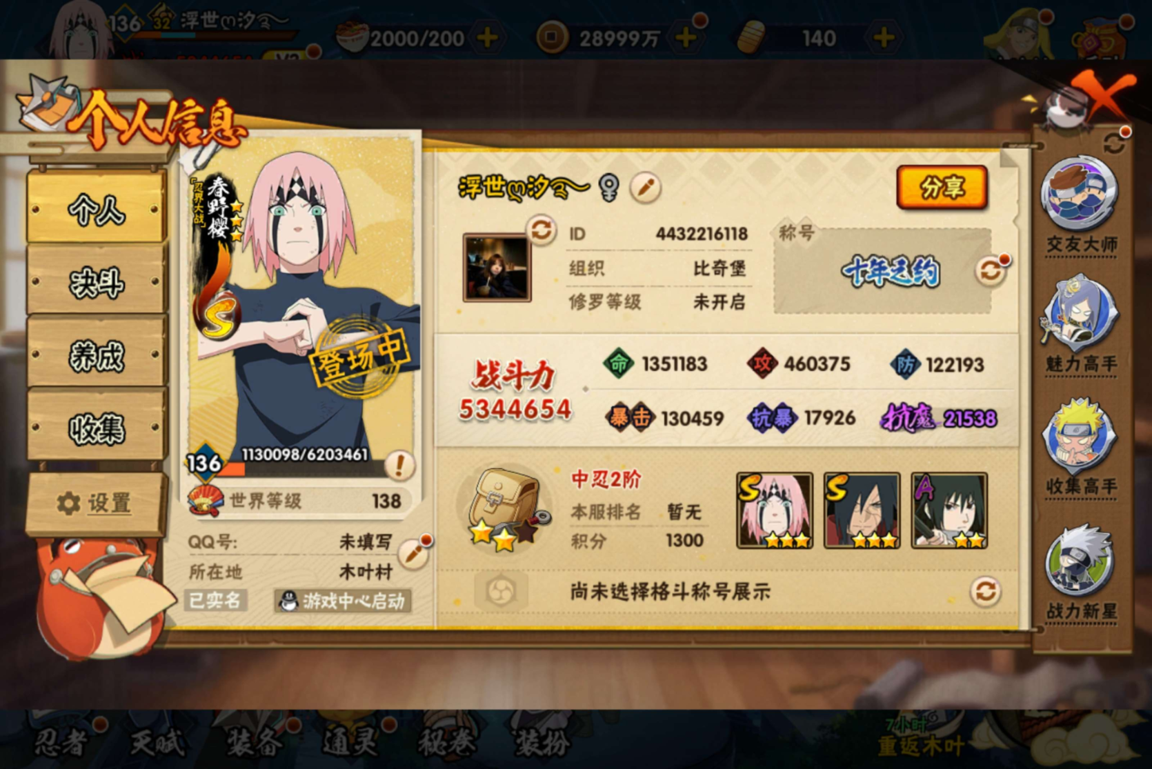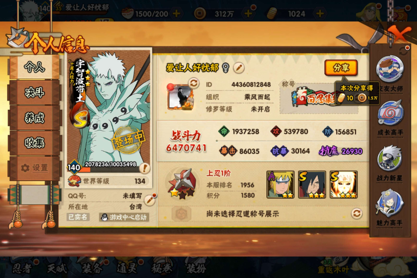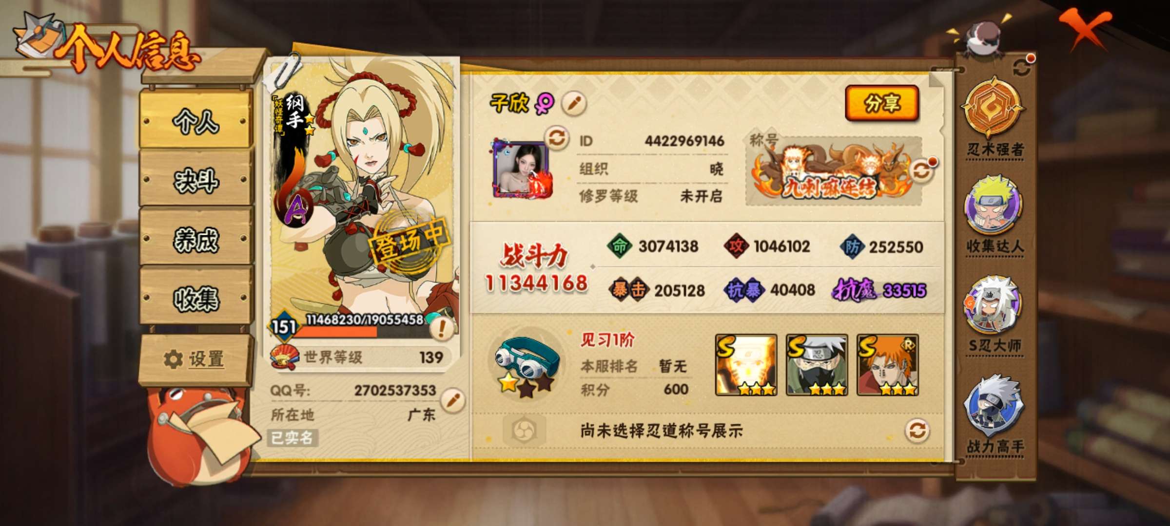 角色等级100 金币150 战斗力1900000 S忍4 A忍9 4 段位中忍