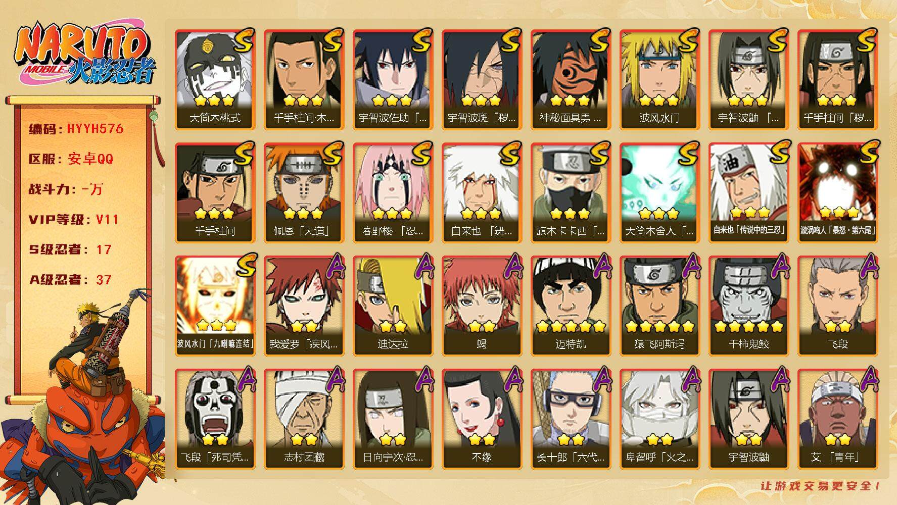 【安卓】仓鼠金币728号,141409金币,39张高招卷,2990限时点券,火影忍者手游QQ区,蜀面