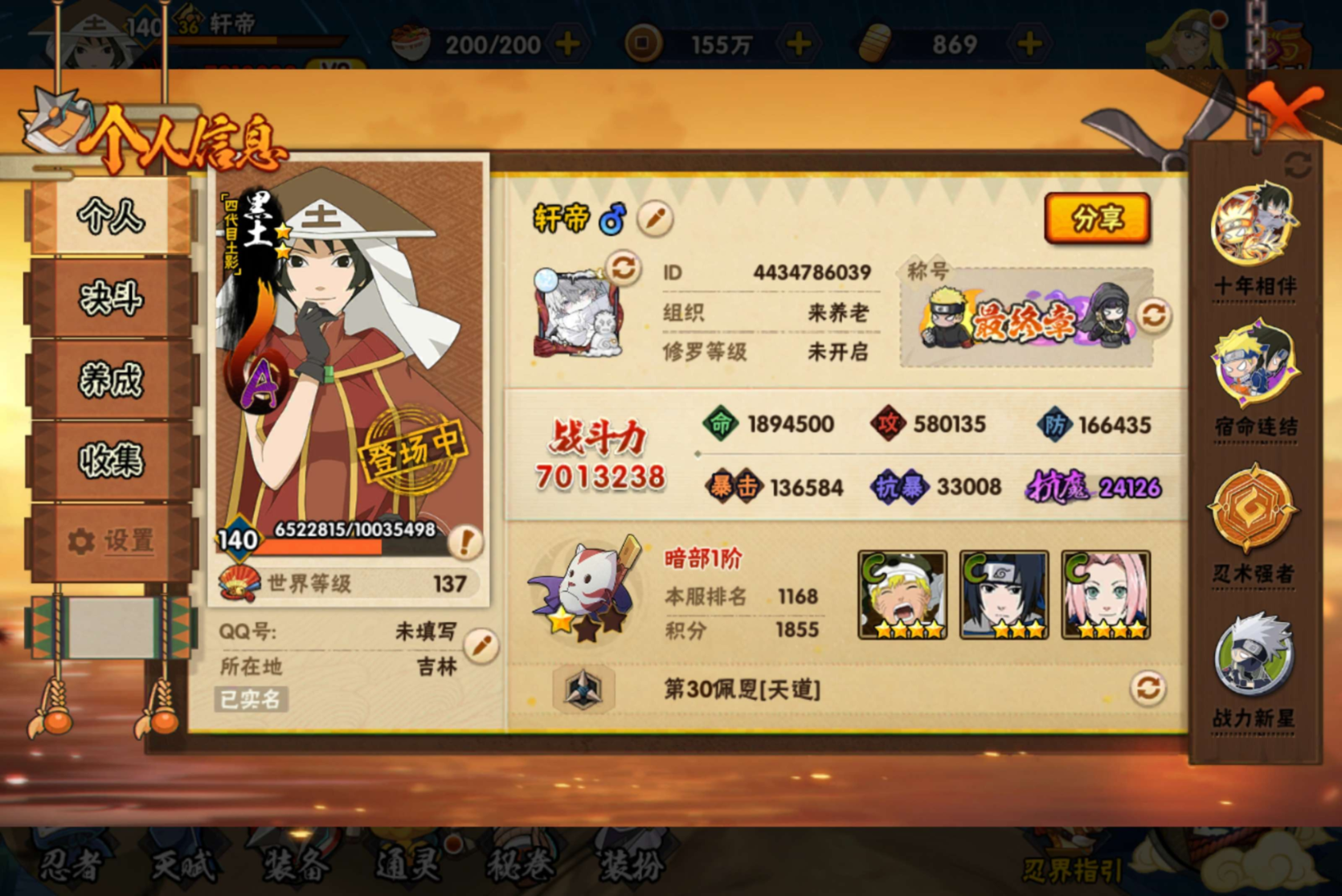 安卓QQ-成品火影号-800万战力-忍发帖基础班-S忍者数