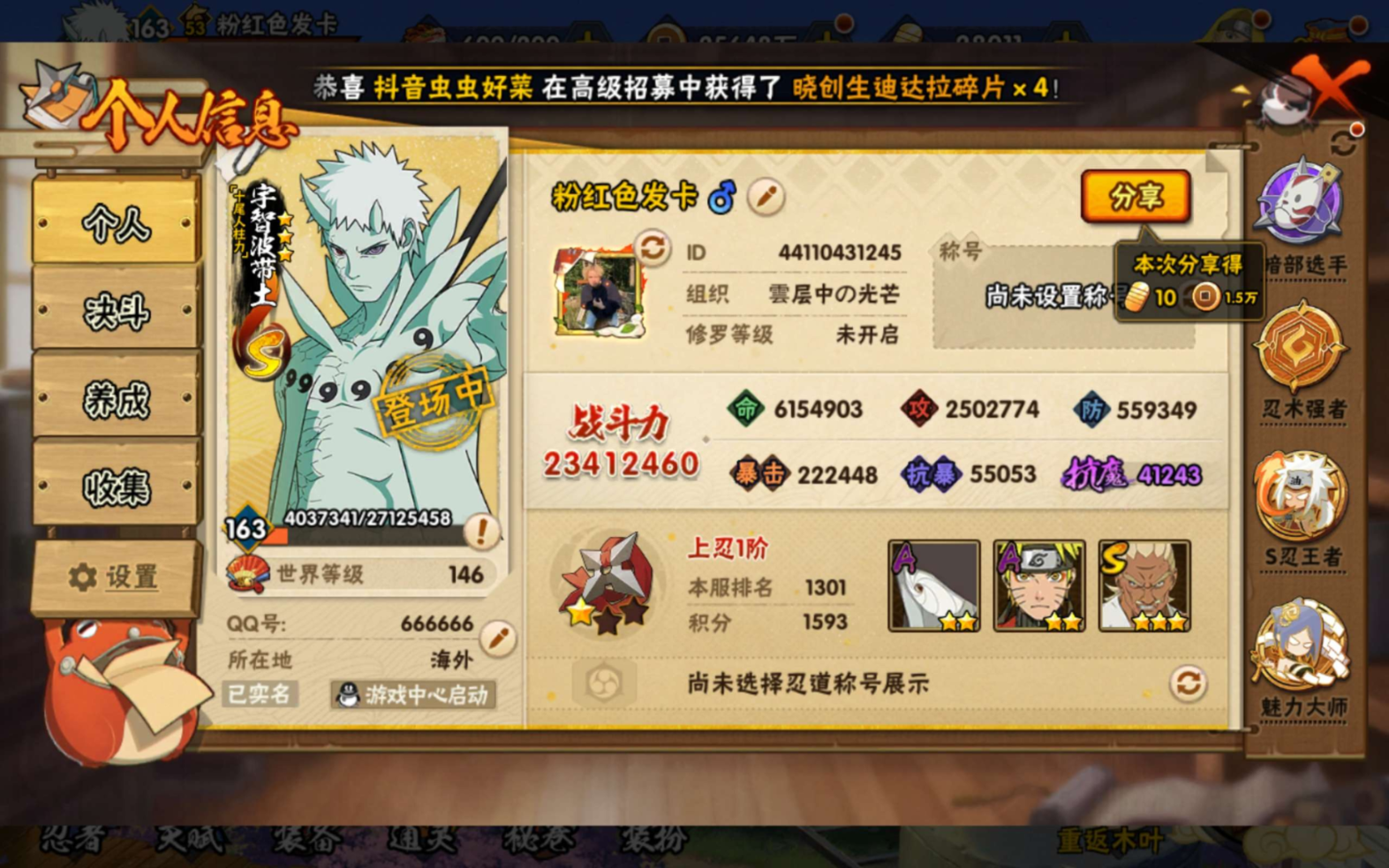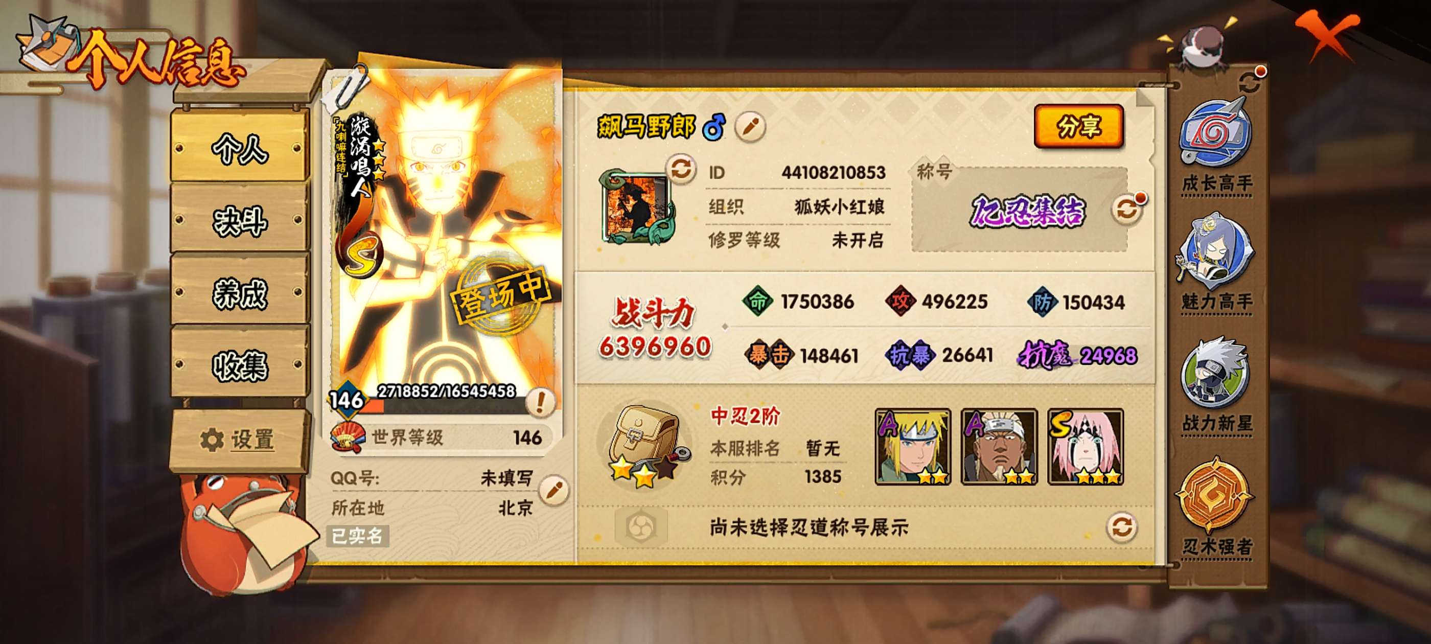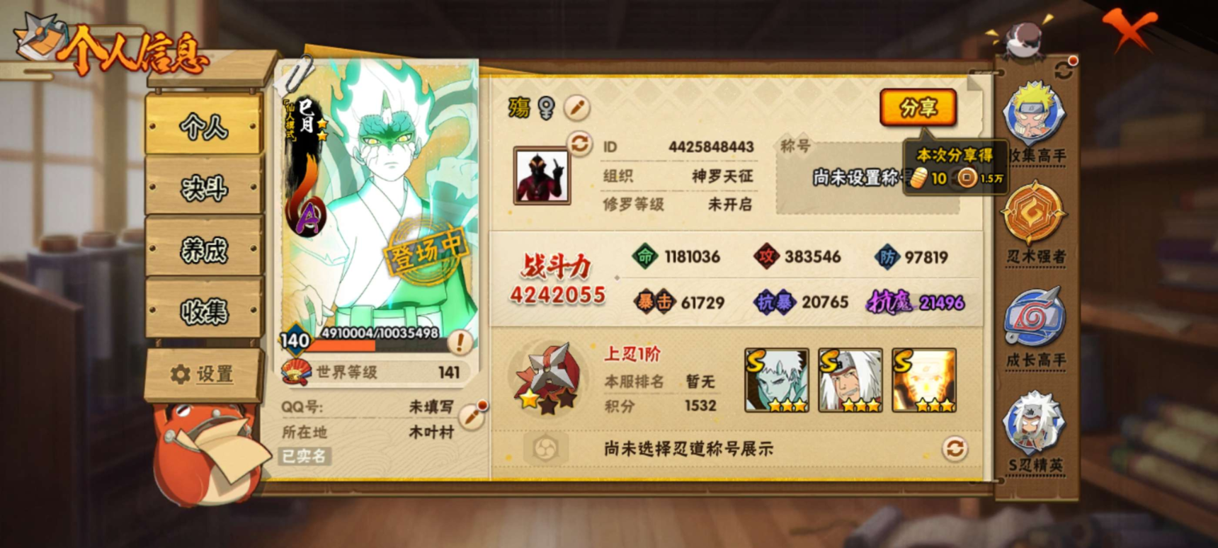 角色等级100 金币150 战斗力1900000 S忍4 A忍9 4 段位中忍