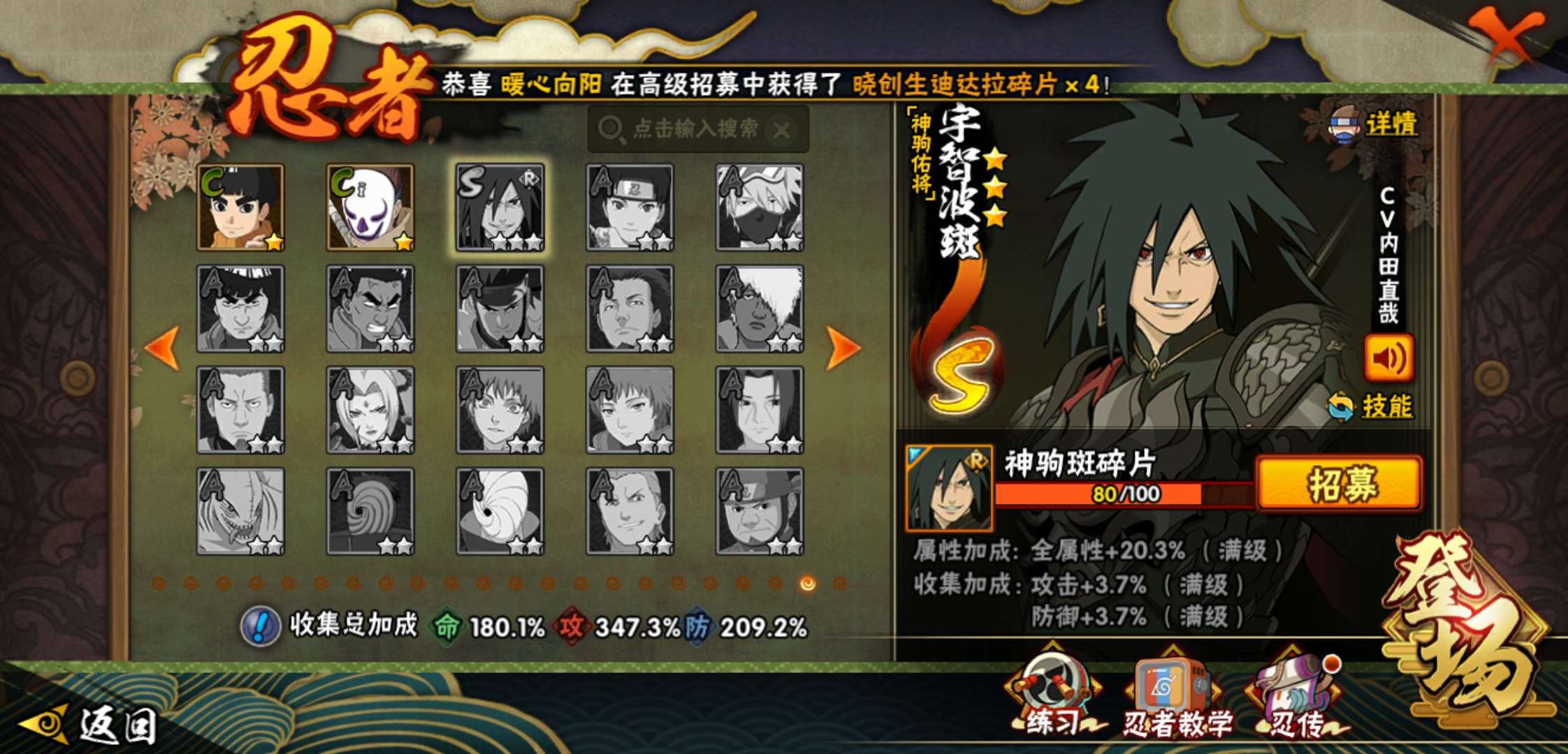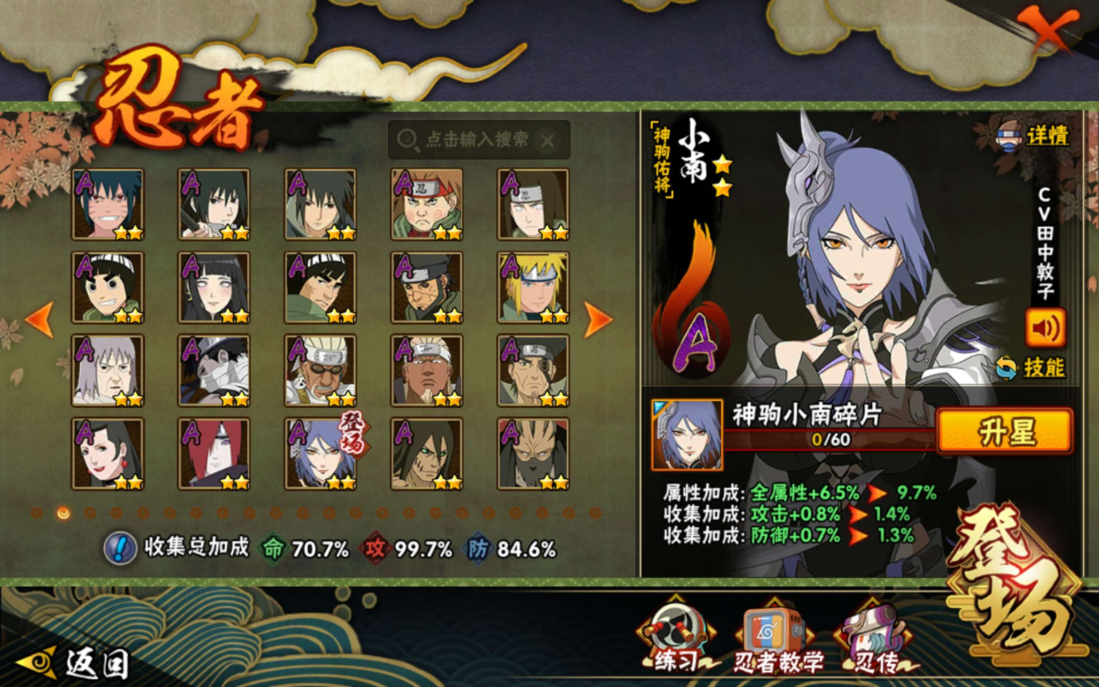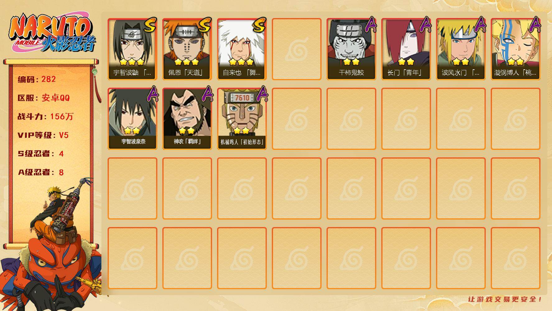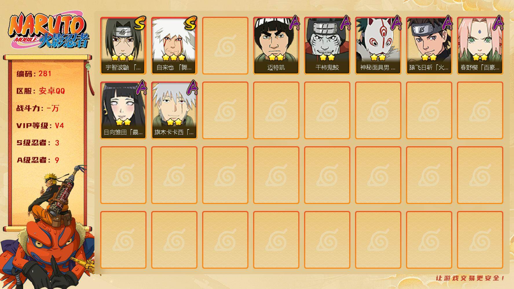 角色等级100 金币150 战斗力1900000 S忍4 A忍9 4 段位中忍