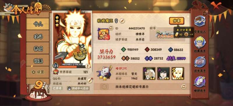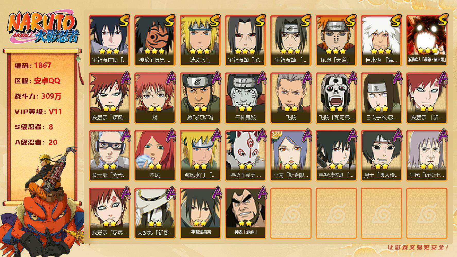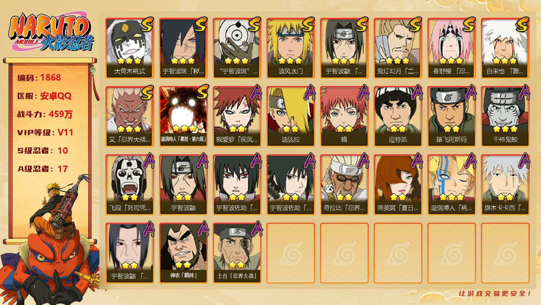 火影忍者【安卓QQ】V11 459万战力 10S级忍者数-17A级忍者数 有熊猫 九喇嘛水门53片