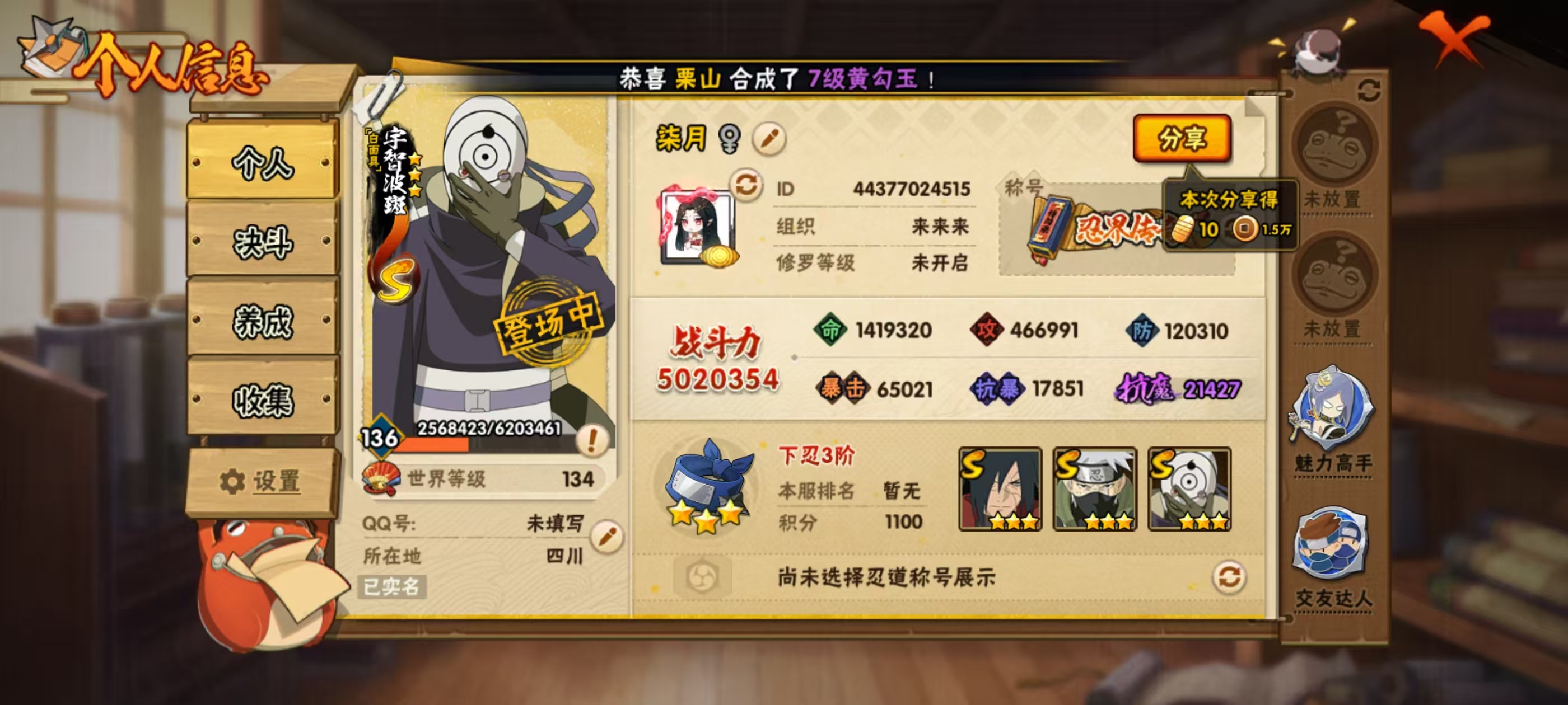 战力550多万,14S,37A,忍法帖买了25的,V10,有熊猫,金币17280,高招卷29,10级