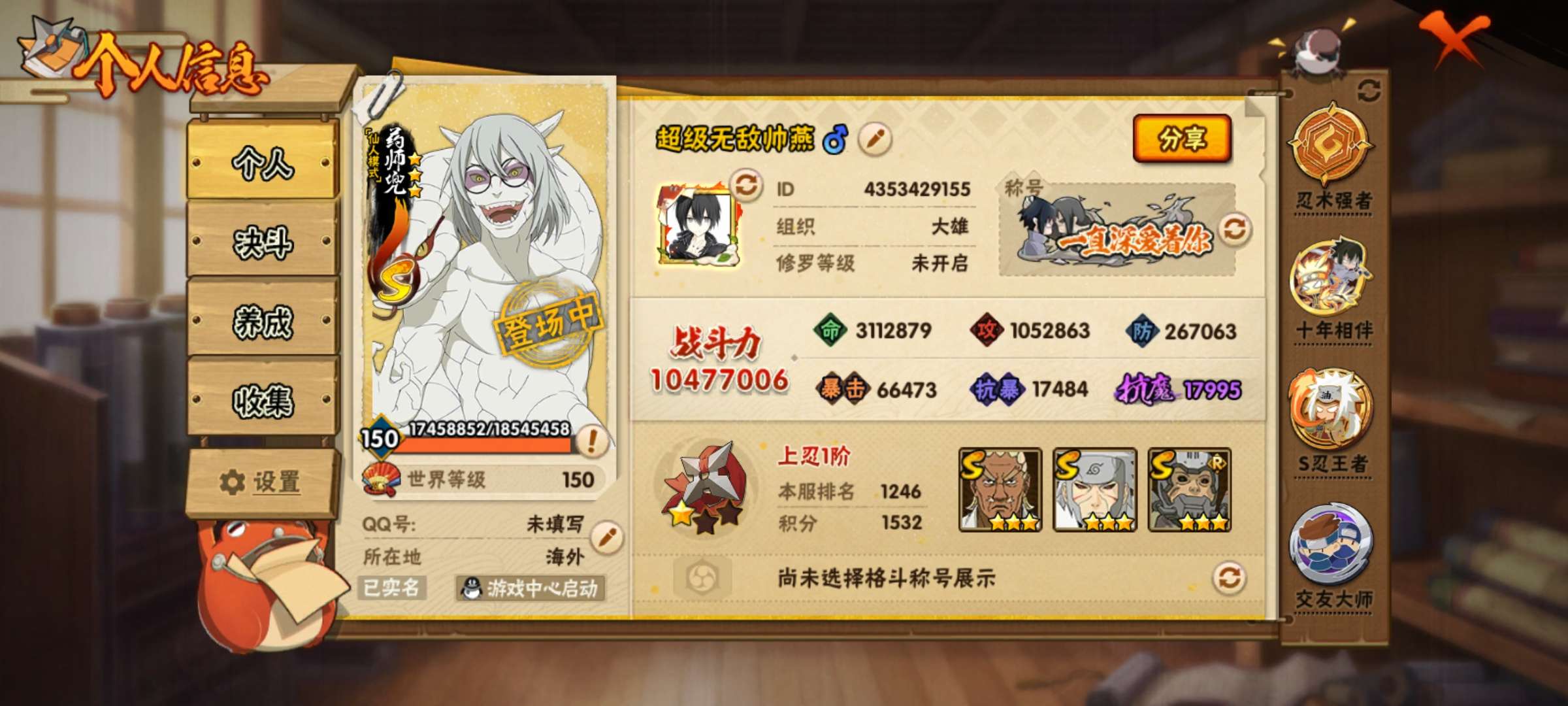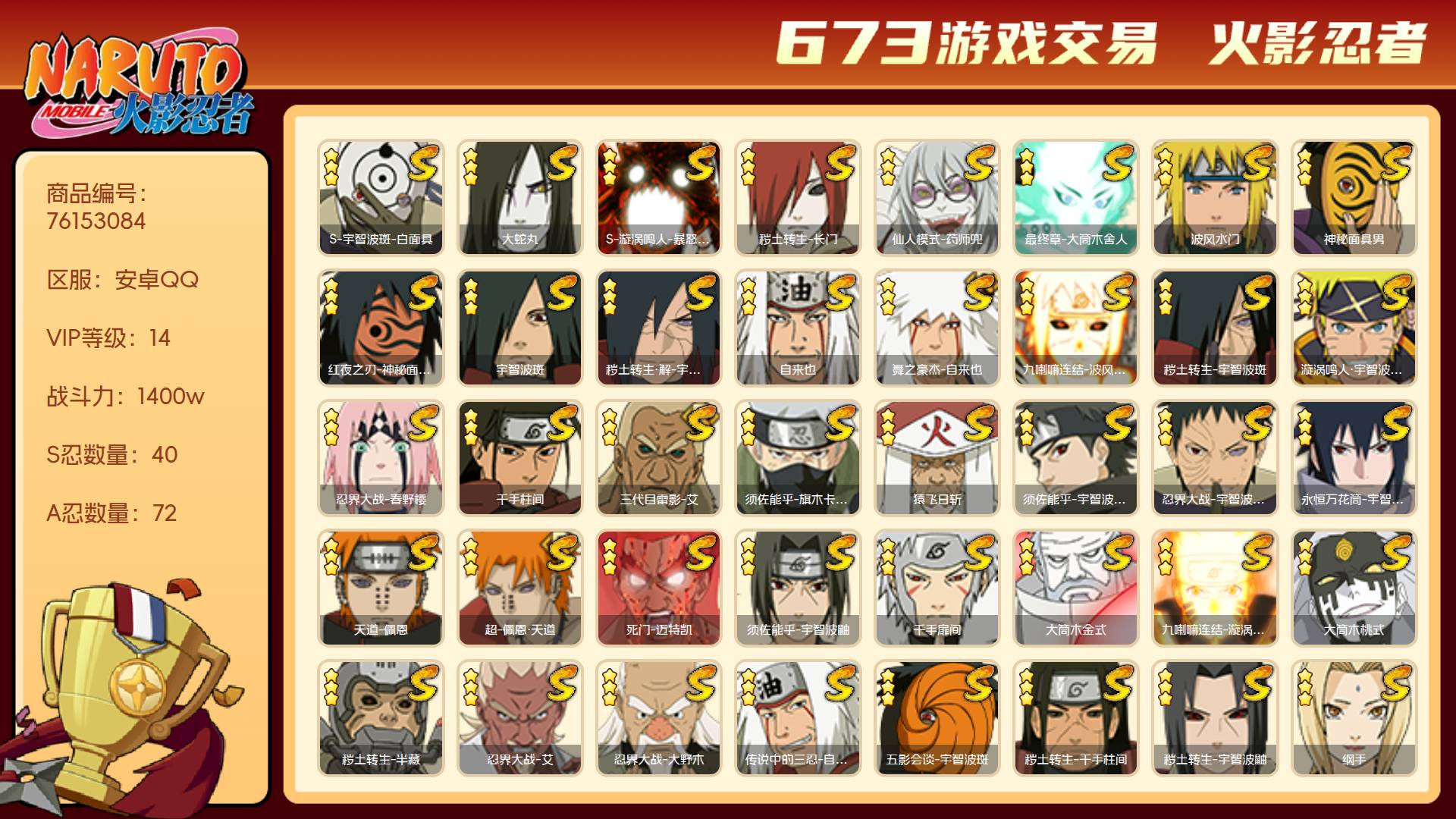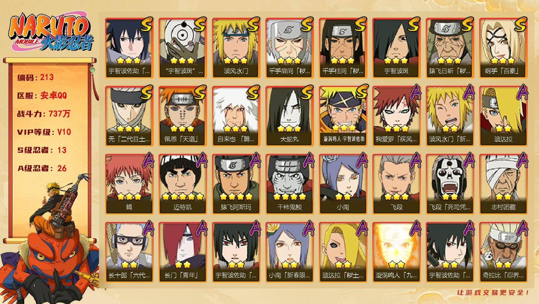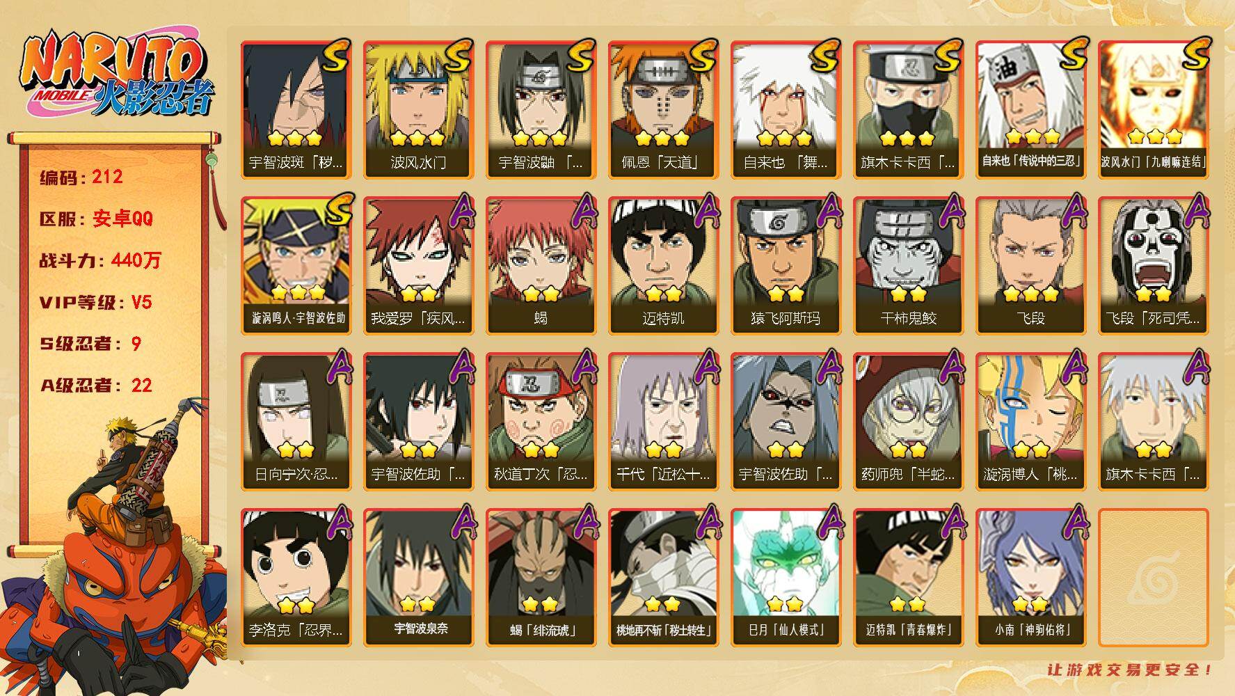 火影忍者账号 VIP8,502W战力,S忍11个,A忍25个