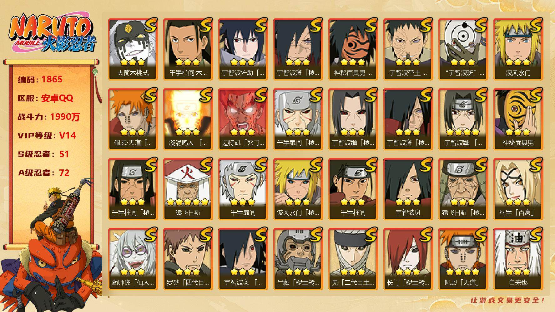 火影忍者【安卓QQ】V14 1990万战力 51S级忍者数-72A级忍者数 有2传承奥义图 有熊猫