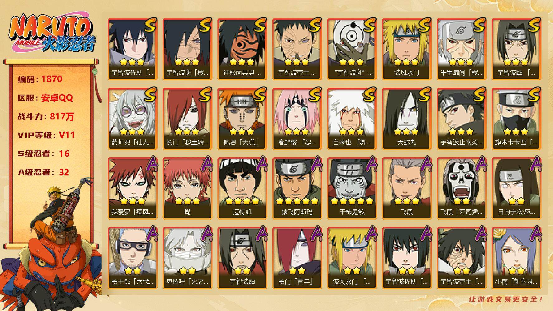 火影忍者【安卓QQ】V11 817万战力 16S级忍者数-32A级忍者数 有熊猫 传说自来也93片