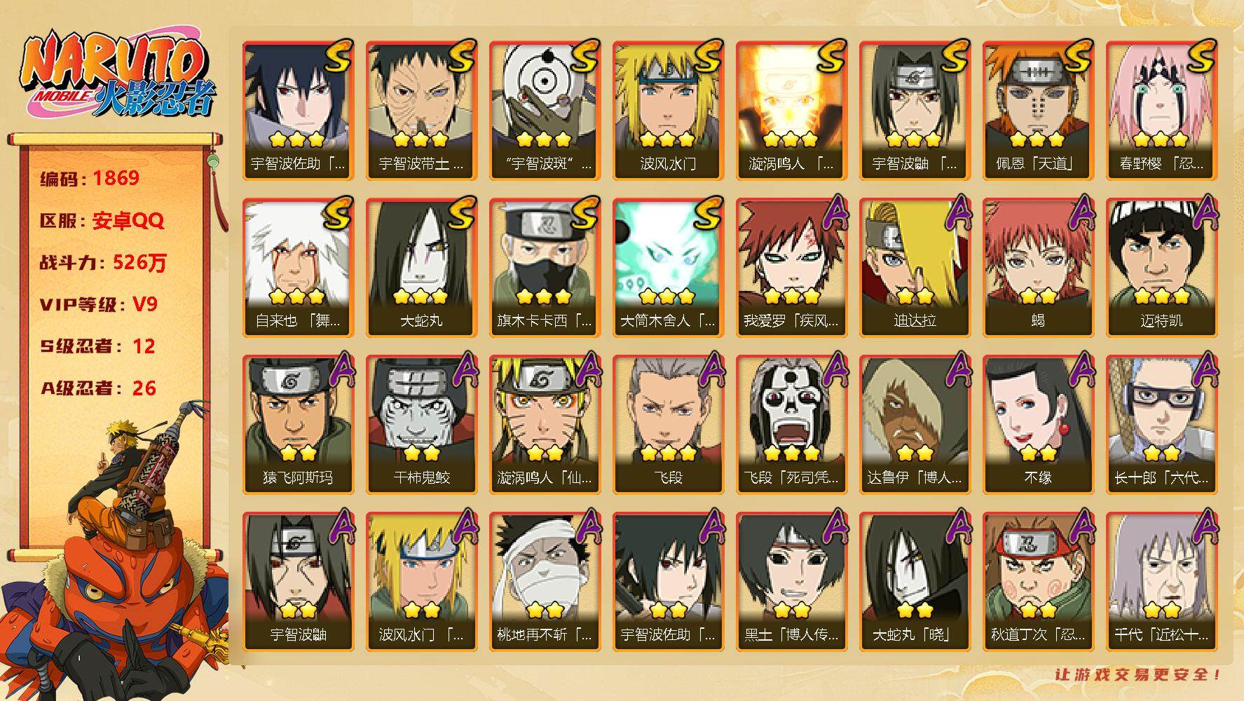 火影忍者【安卓QQ】V9 526万战力 12S级忍者数-26A级忍者数 传说自来也80片 LL5