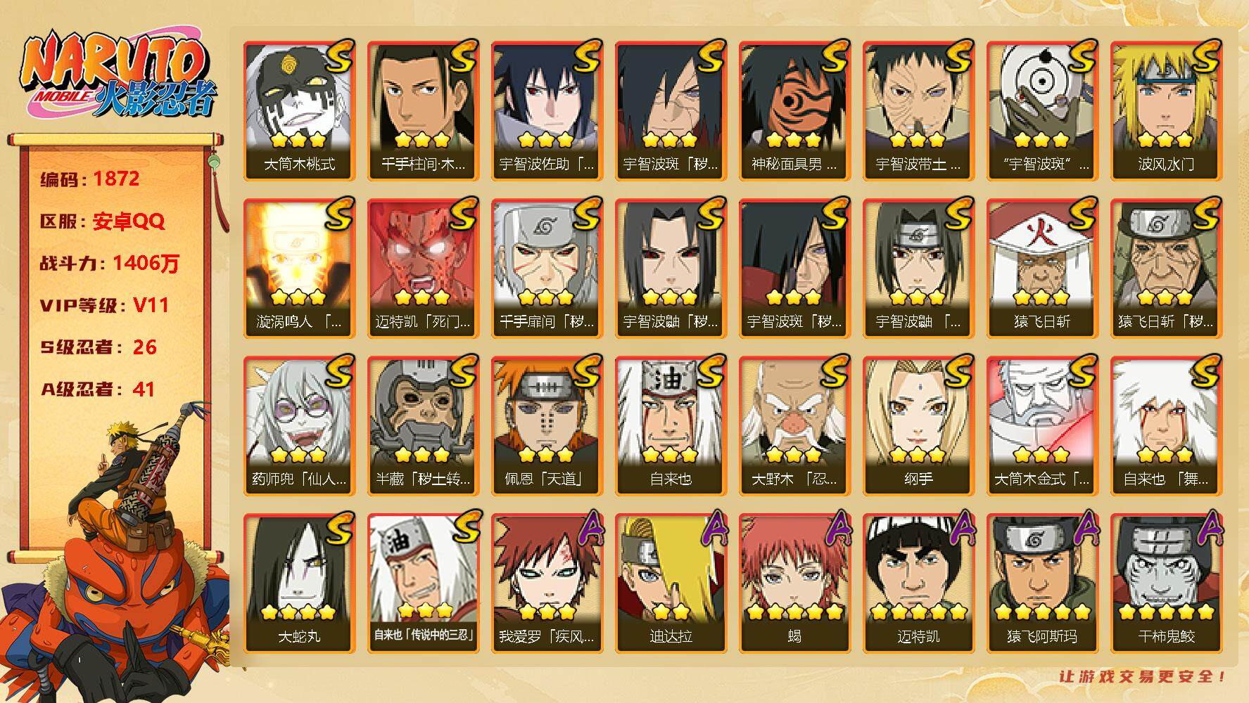 火影忍者【安卓QQ】V11 1406万战力 26S级忍者数-41A级忍者数 有熊猫 忍战樱68片