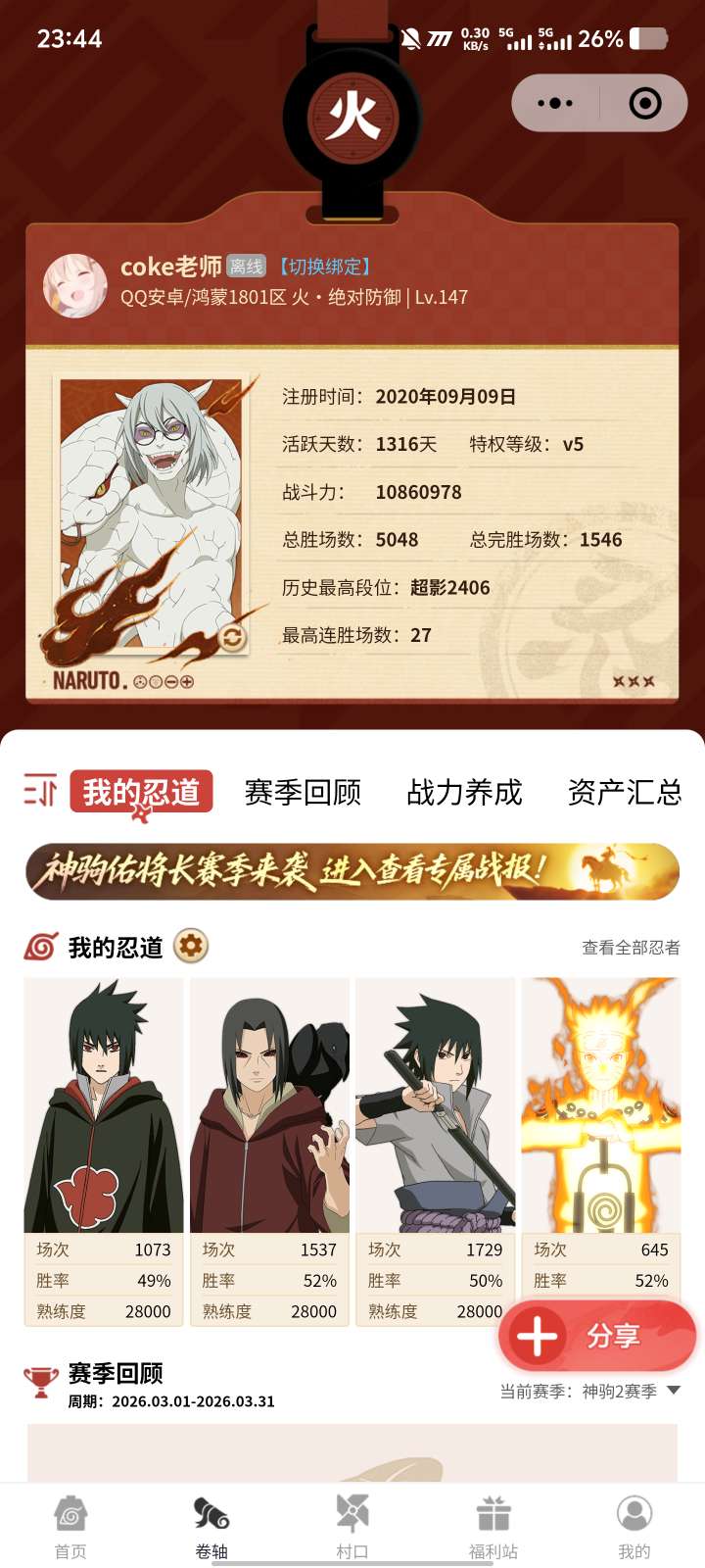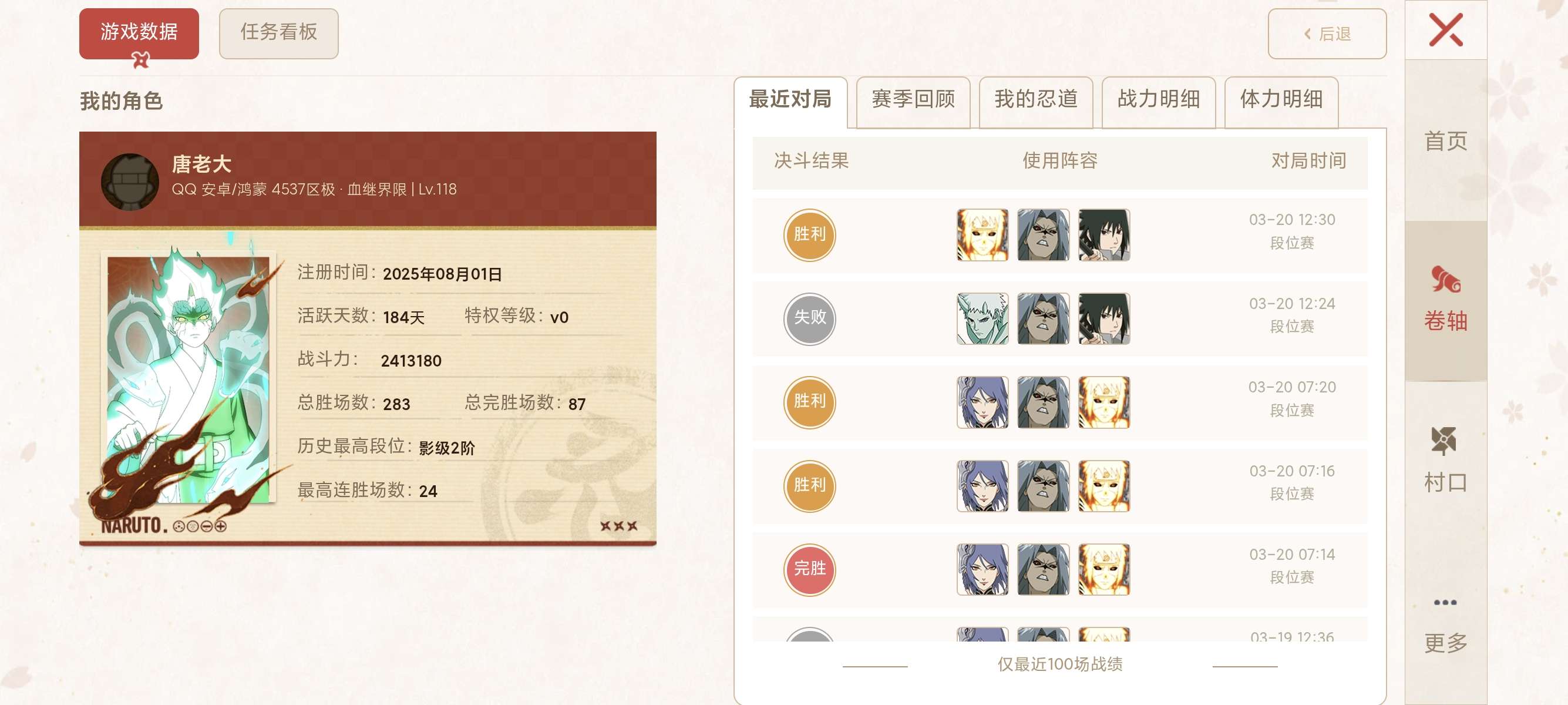 角色等级153 金币算上月卡还有两万多 战斗力1400w S忍40 A忍72 14 段位暗部