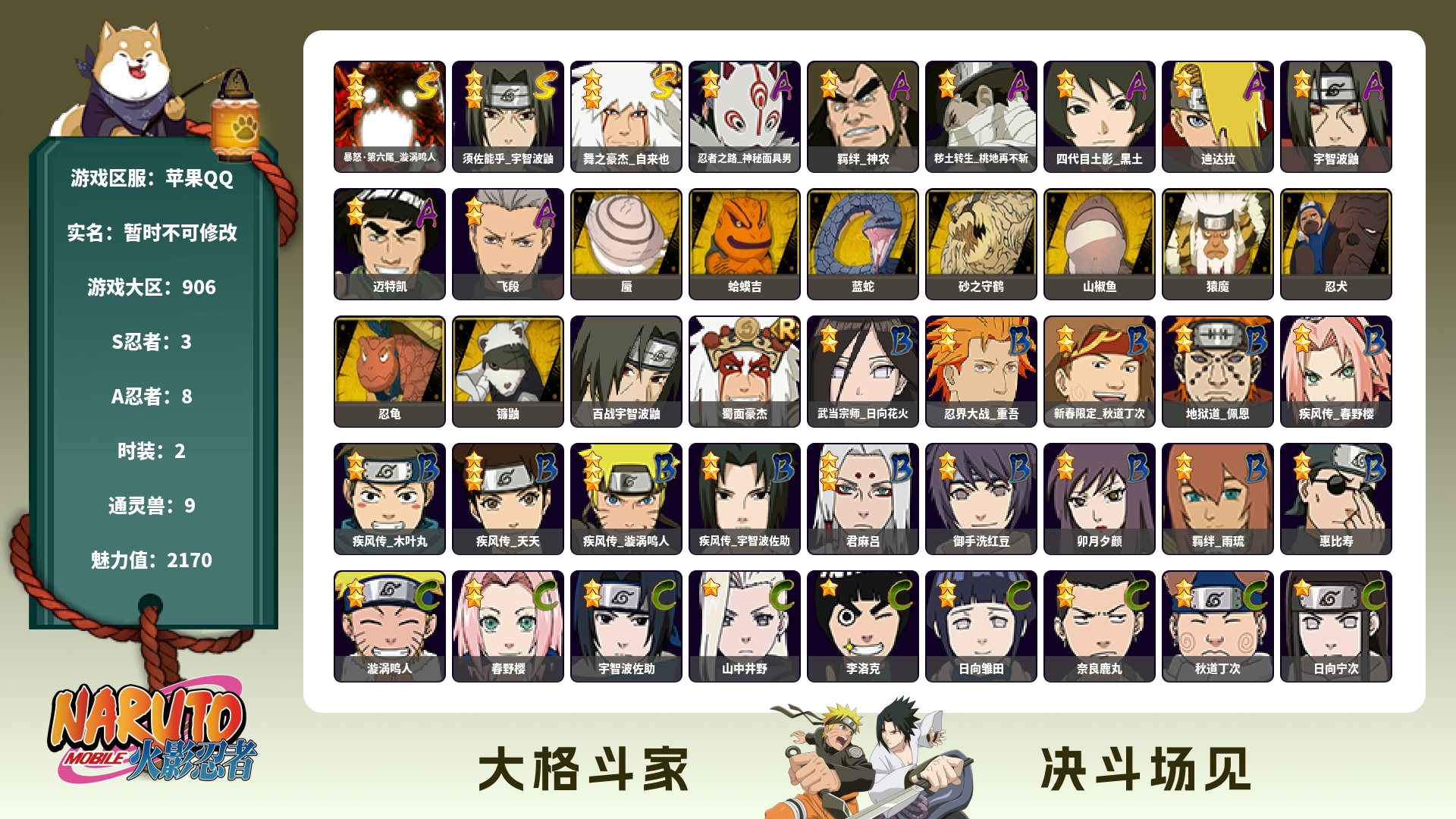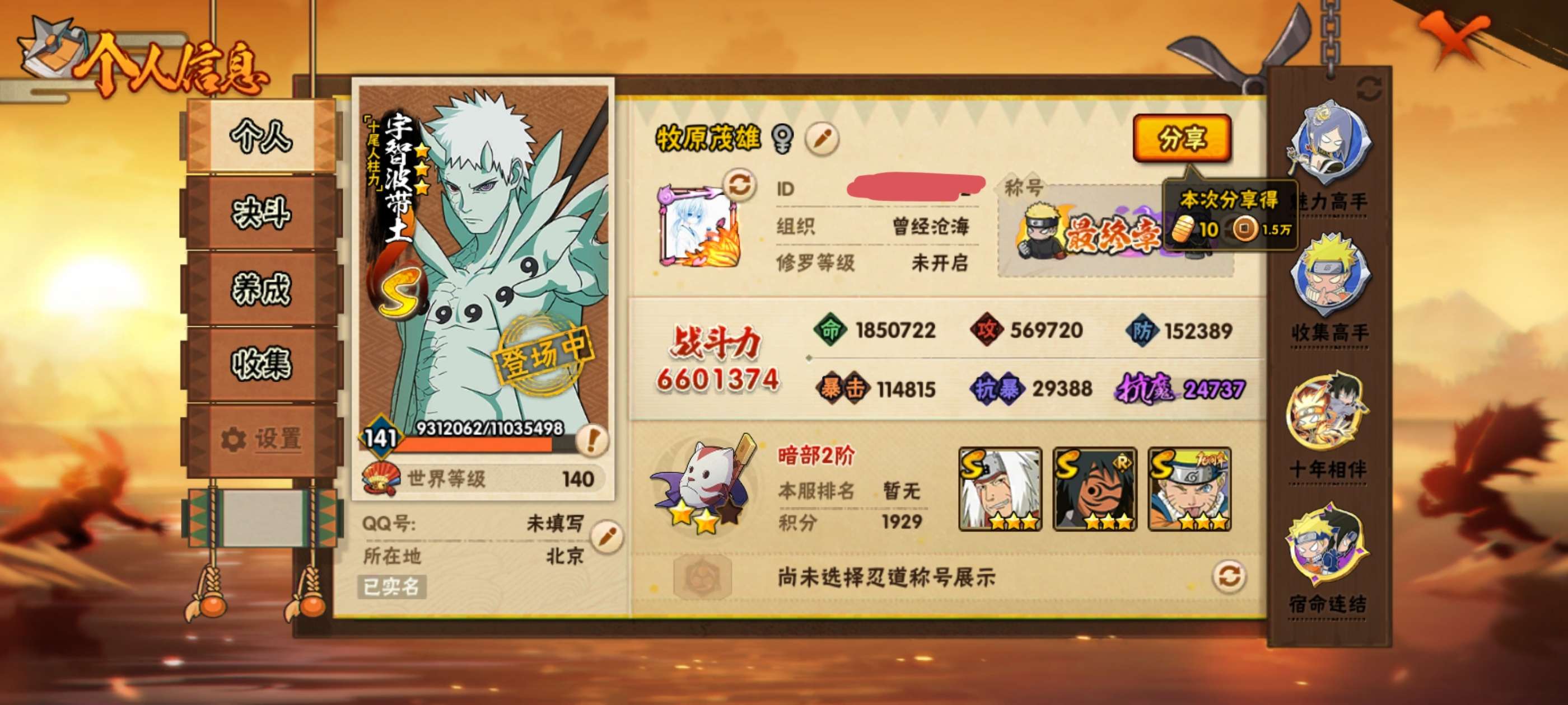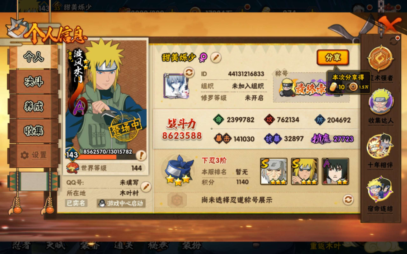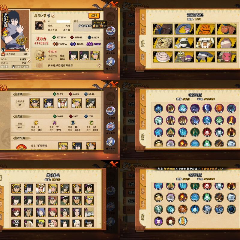 角色等级148 金币500 战斗力900w S忍28 A忍54 5星S忍者26 11 段位上忍