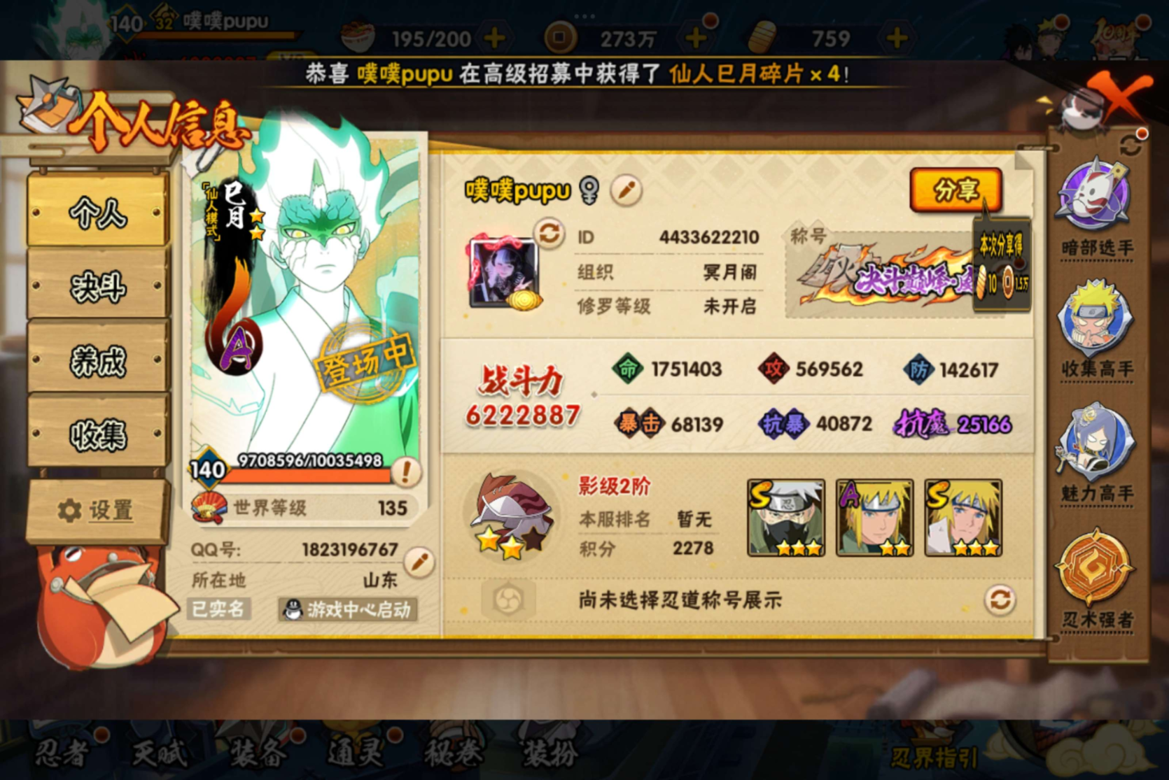 (可转苹果)160w战力六道带土s+暴怒小孩298点卷a共7