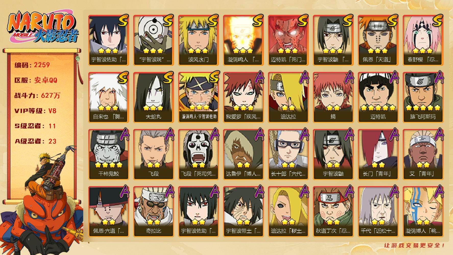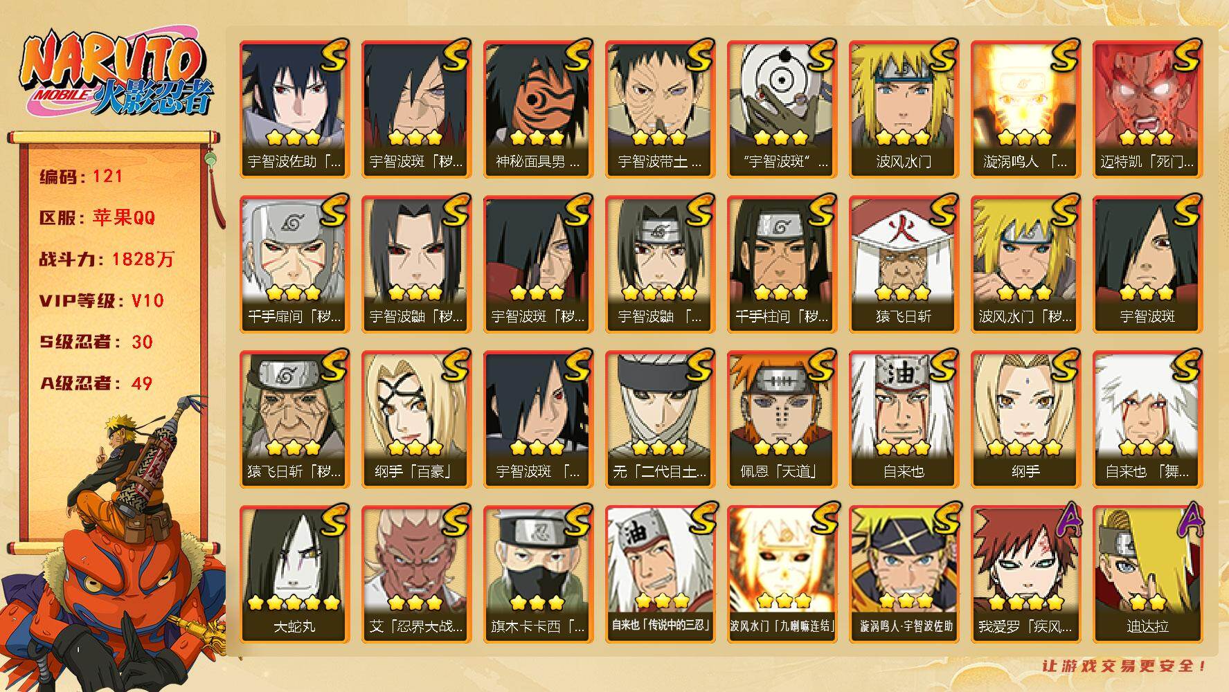 (可免费转苹果)V8 11S 23A 627万战力 4800金币 秽土鼬62片