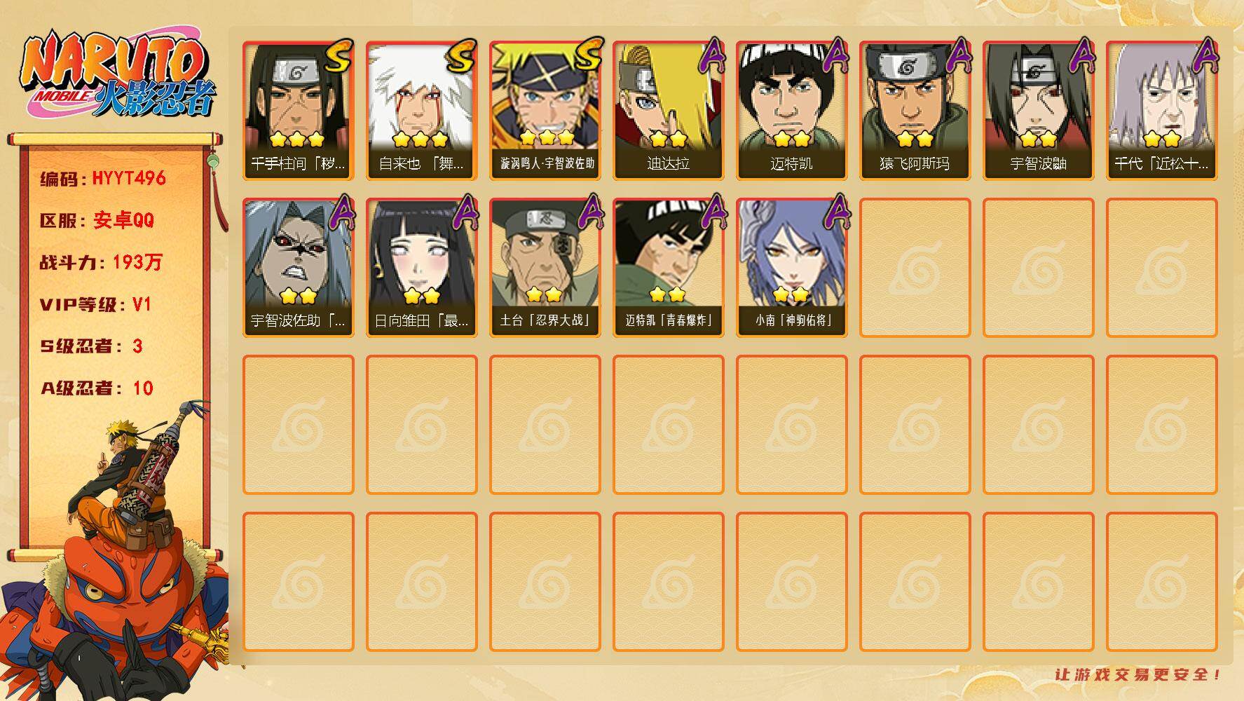 VIP等级V1/战力193W/S忍数量3/A忍数量10/
