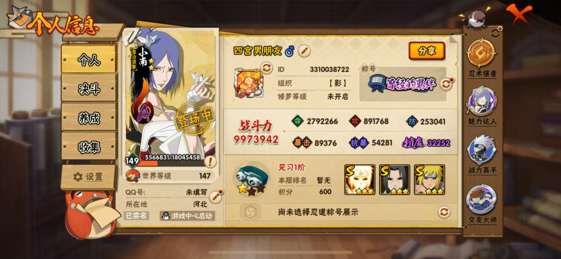 VIP13,1038W战力,S忍29个,A忍51个,