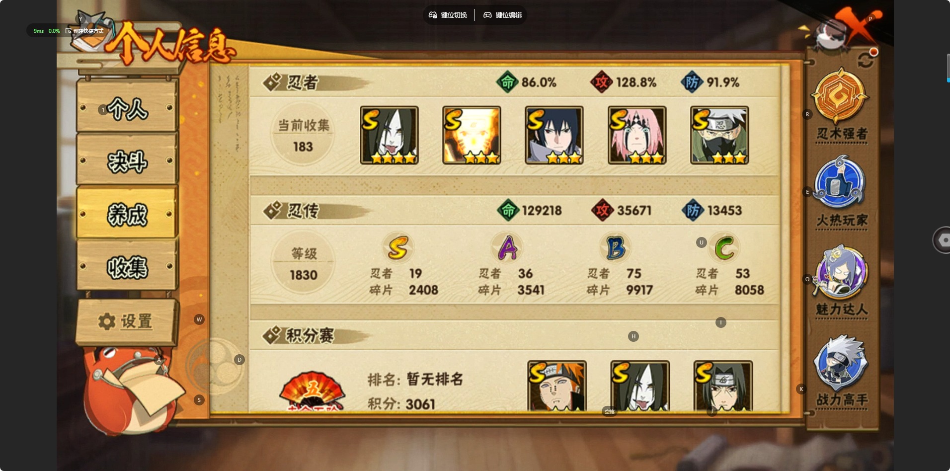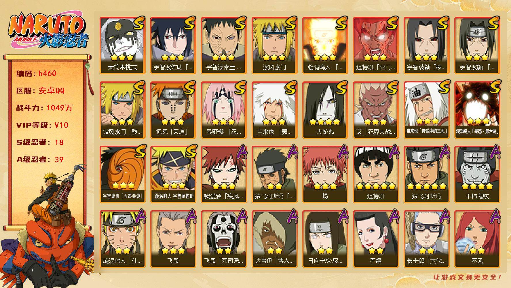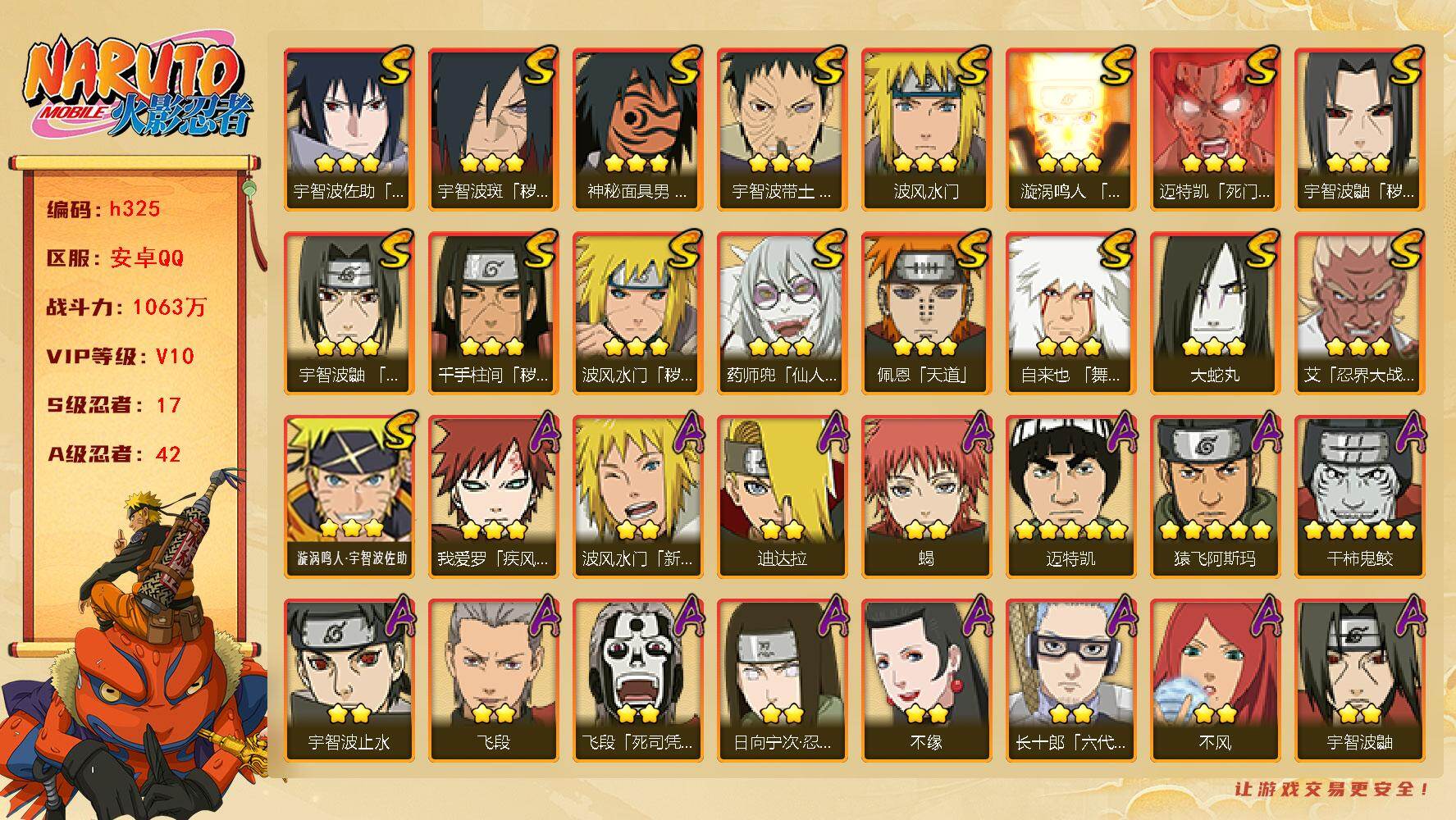 VIP10,1131W战力,S忍19个,A忍43个,自来也77片,带土67片
