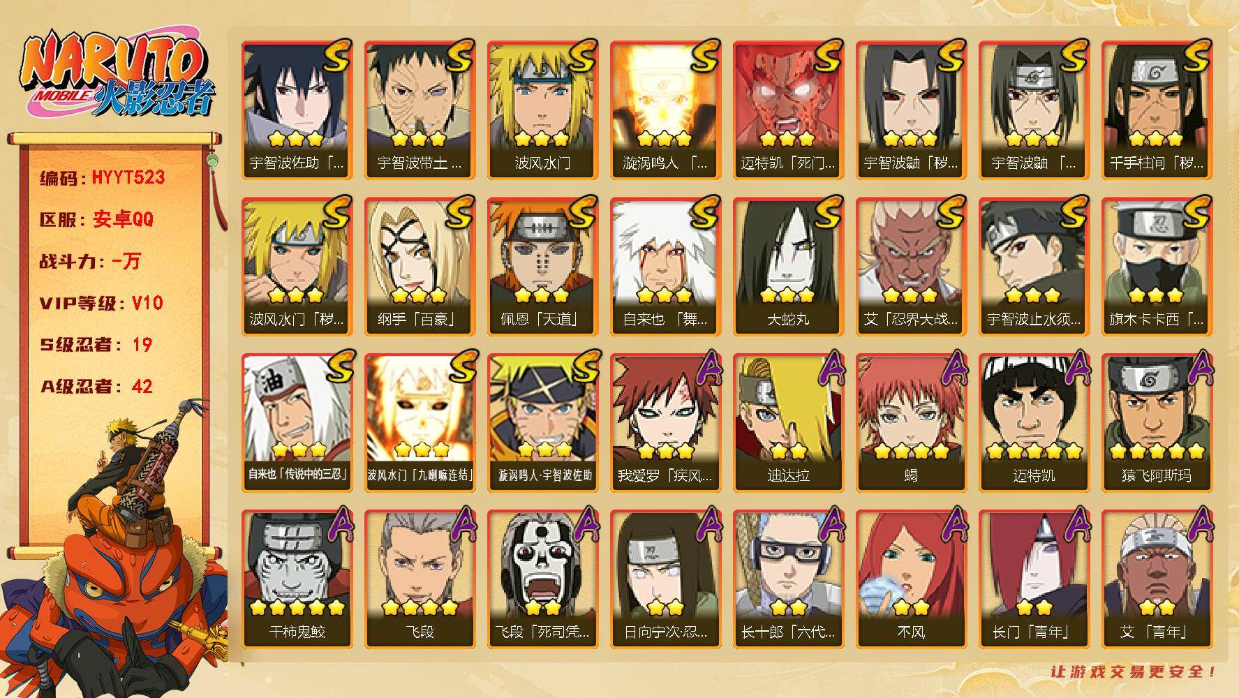 VIP等级V10/S忍数量19/A忍数量42/百豪-纲手/3星