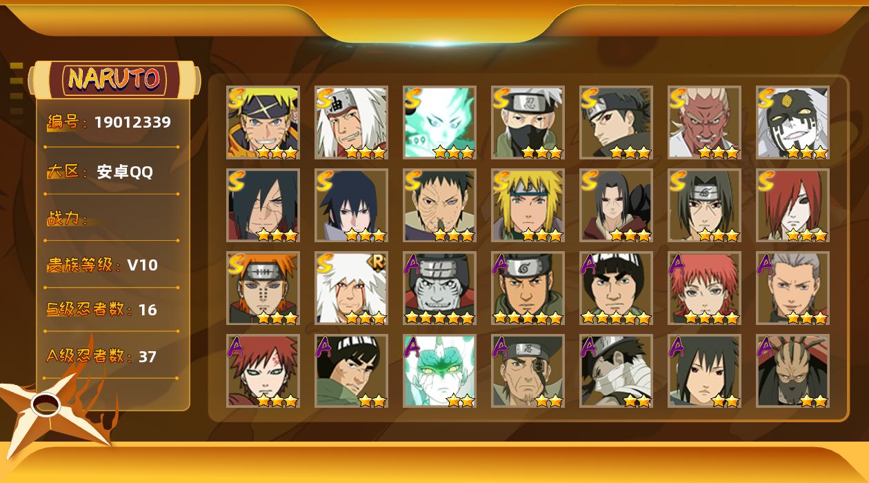 VIP等级V12/战力1039W/S忍数量19/A忍数量37/