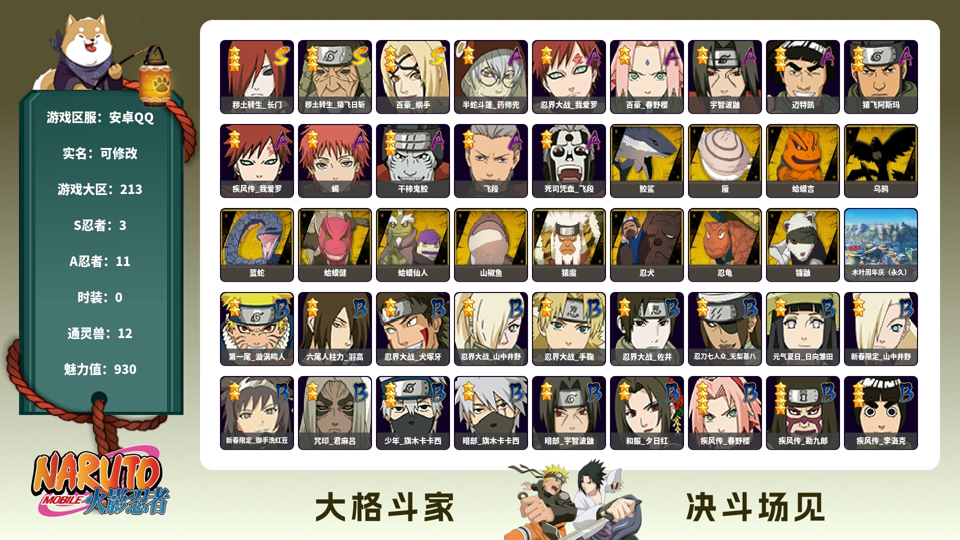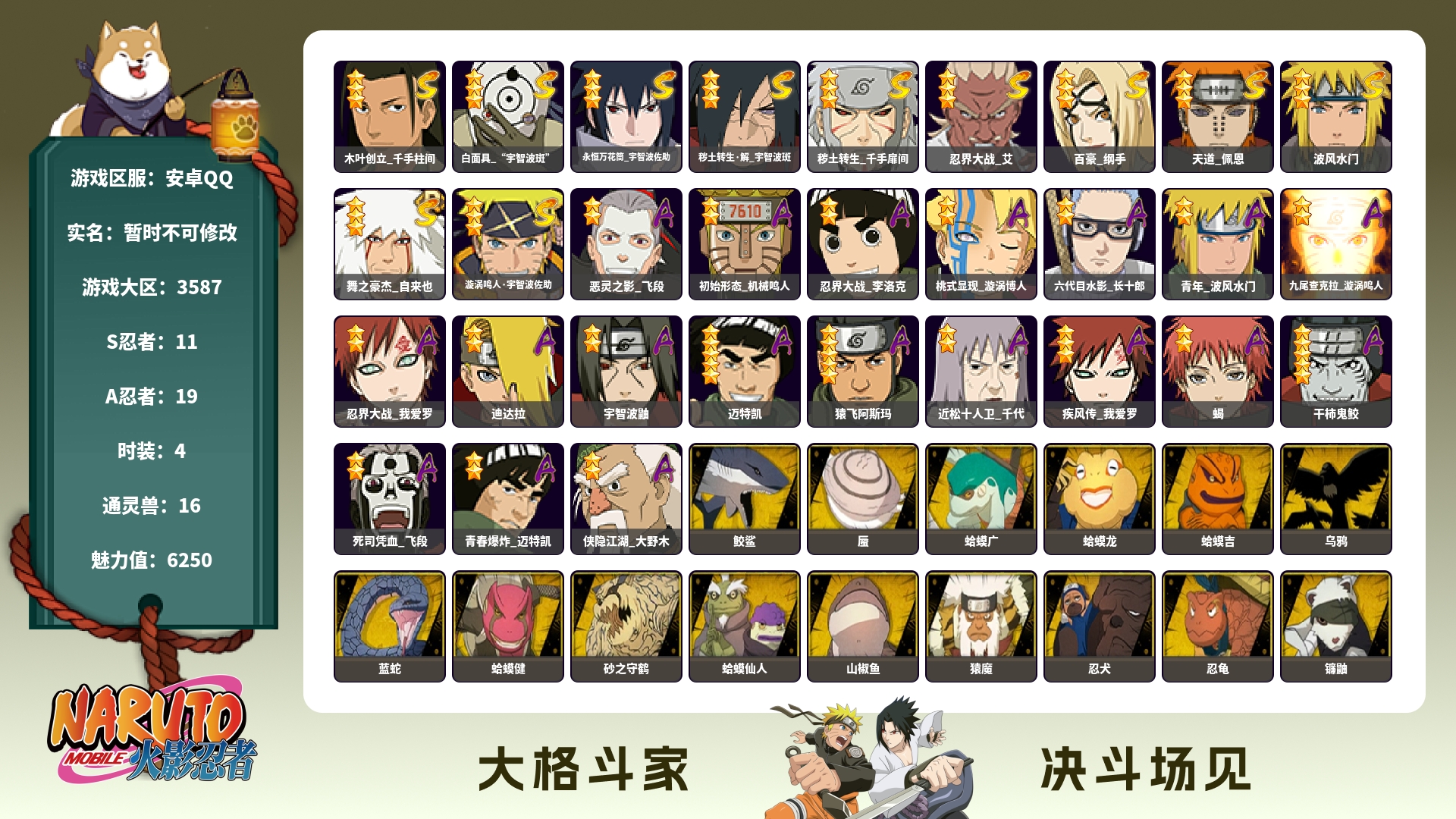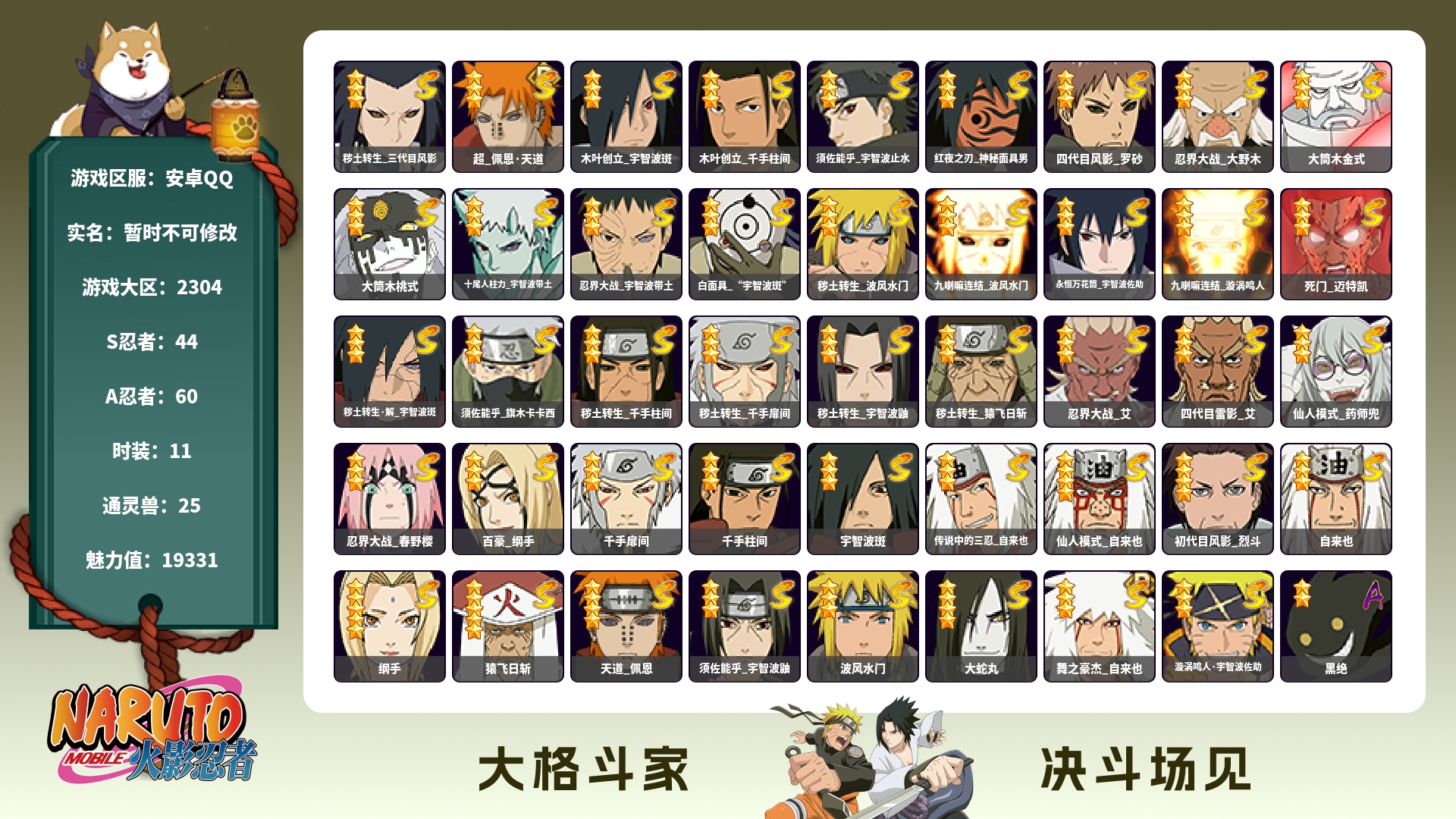 620W战力白面创柱紫狗11S+恶灵飞段19A+绿牛碎片70