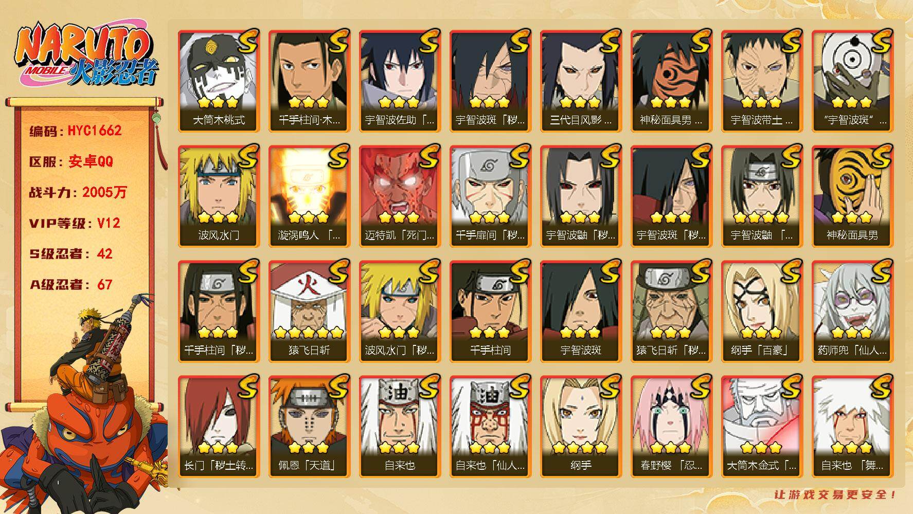 VIP等级V12/战力2005W/S忍数量42/A忍数量67/