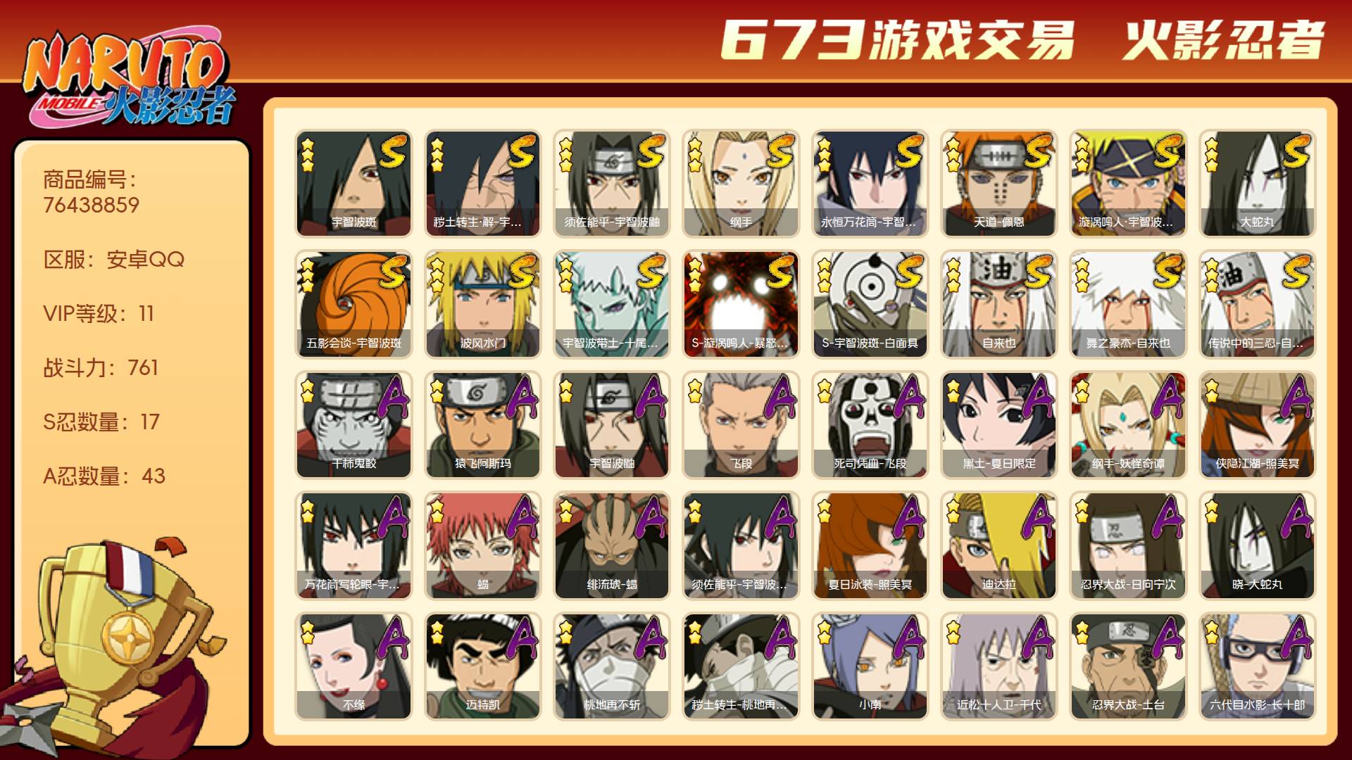 角色等级142 金币229 战斗力761 S忍17 A忍43 5星S忍者13 11 段位中忍