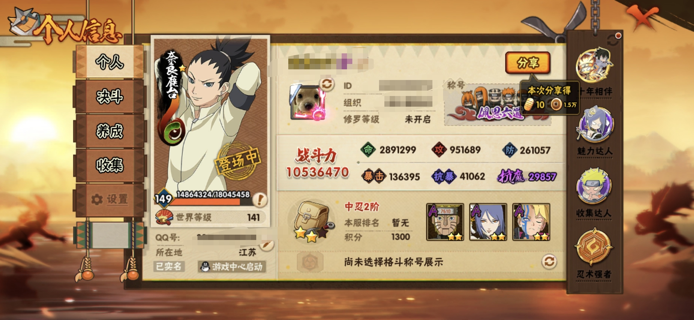 角色等级149 金币100 战斗力1061 S忍22 A忍38 5星S忍者19 8 段位下忍