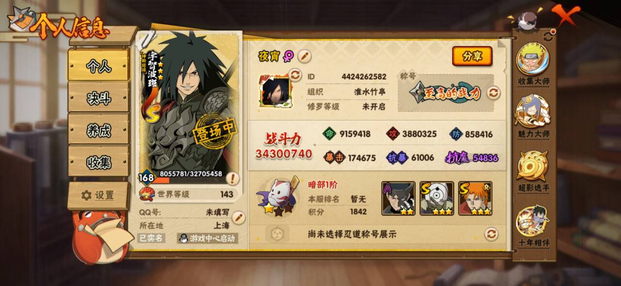 角色等级113 金币2000 战斗力250万 S忍6 A忍17 5星S忍者3 8 段位上忍