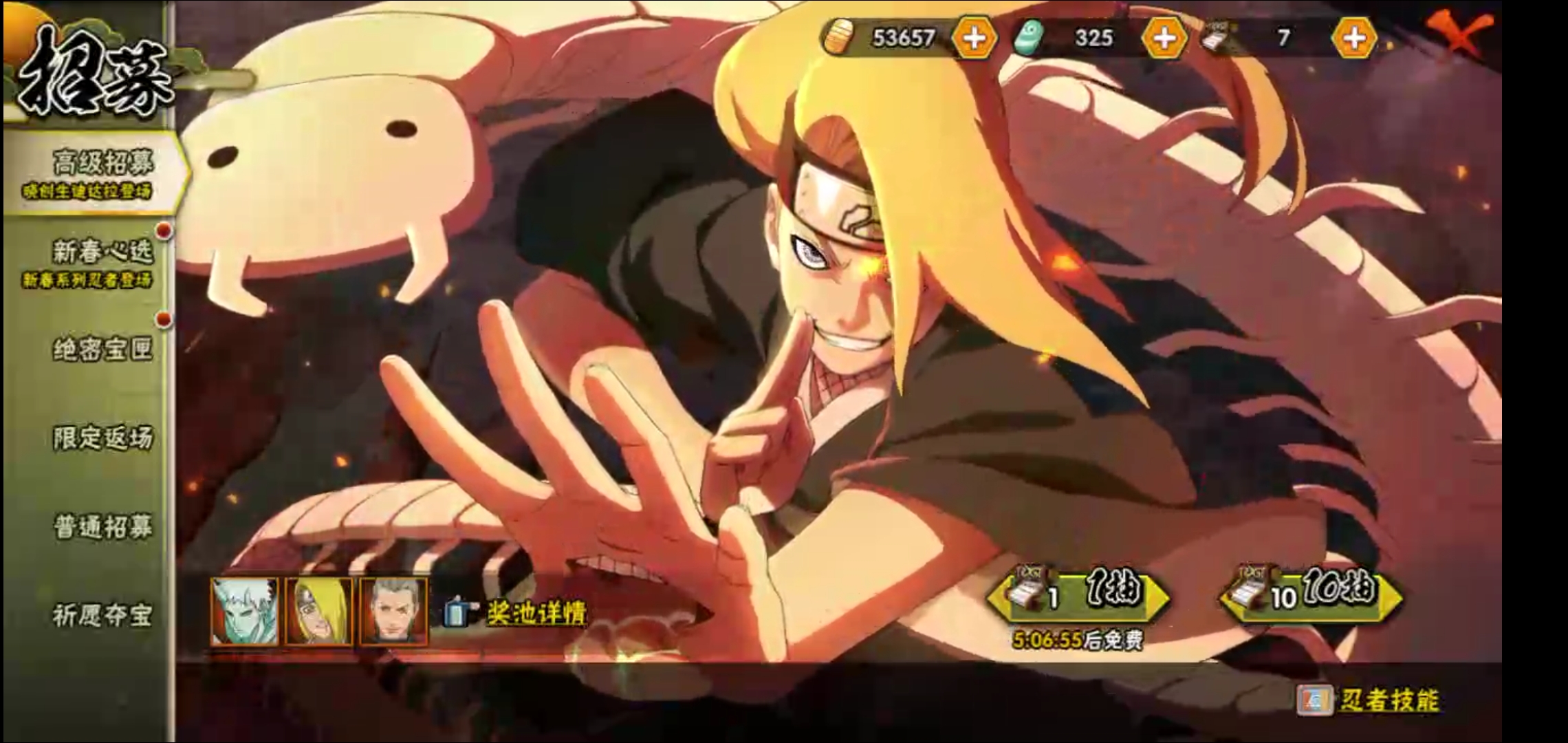 53657金币,点券325,高招券7,十尾带土,迪达拉30片,忍法帖无限续杯