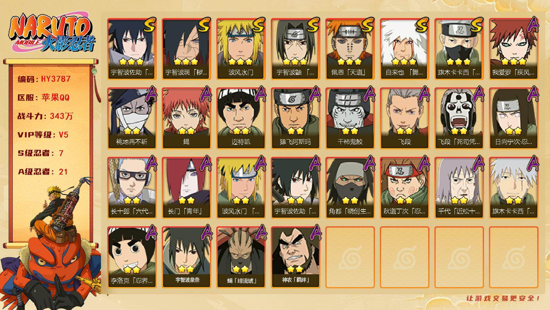 火影忍者【苹果QQ】V5/战力343W/S忍7/A忍21/忍界大战-日向宁次