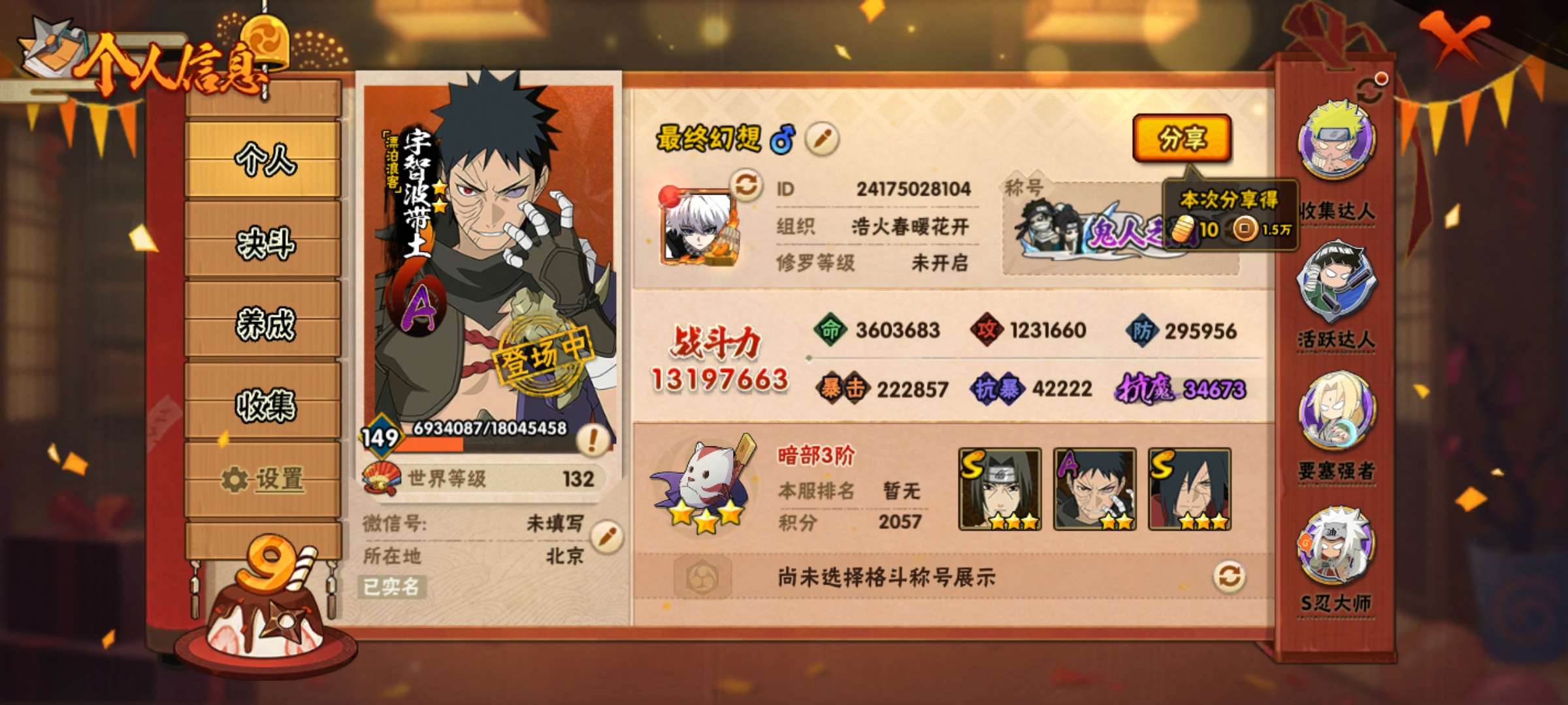 火影忍者【安卓QQ】44S,56A,忍法帖已氪198,V等级13,金币16274,高招卷33,满级霸体,战力2275万