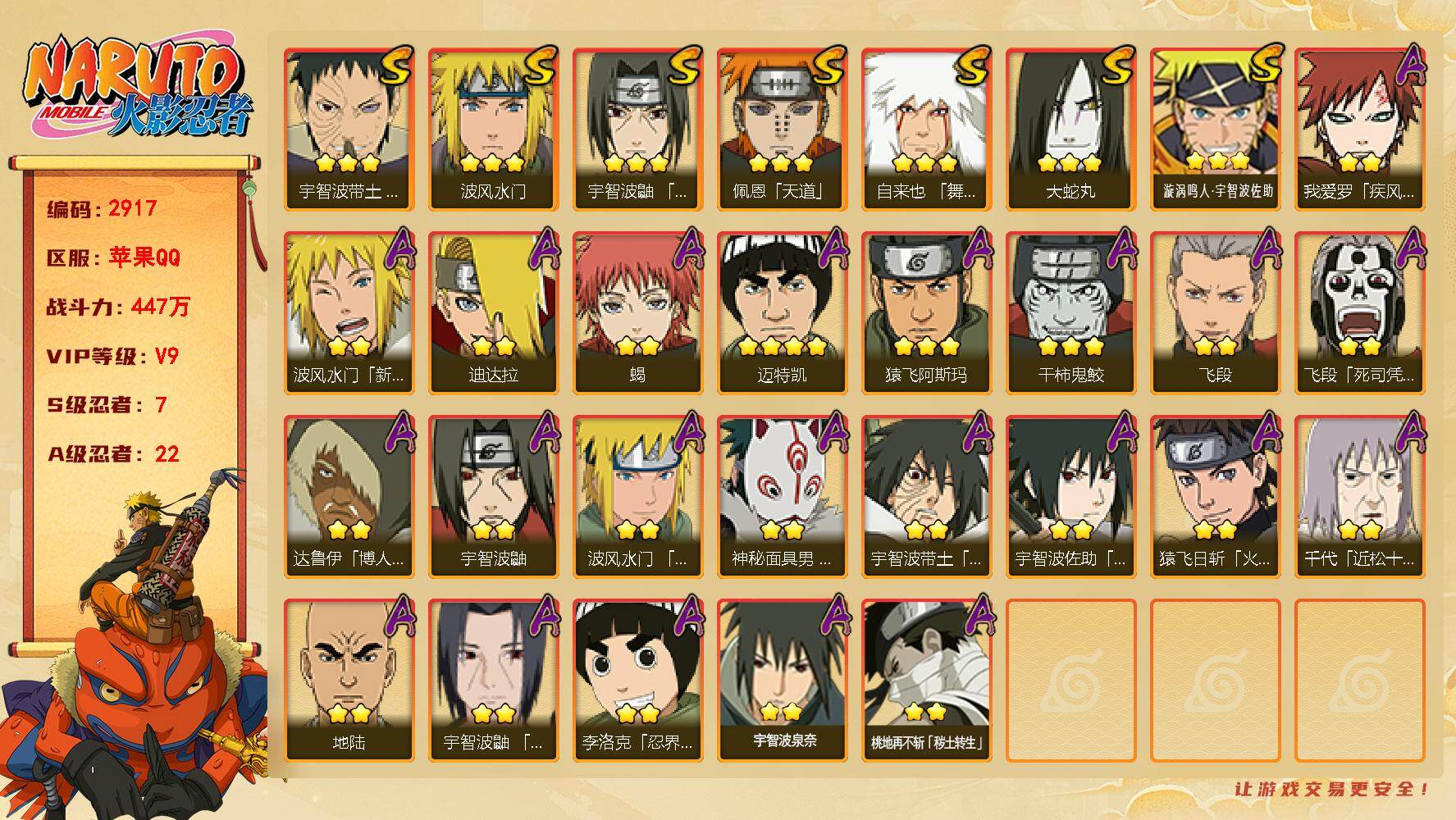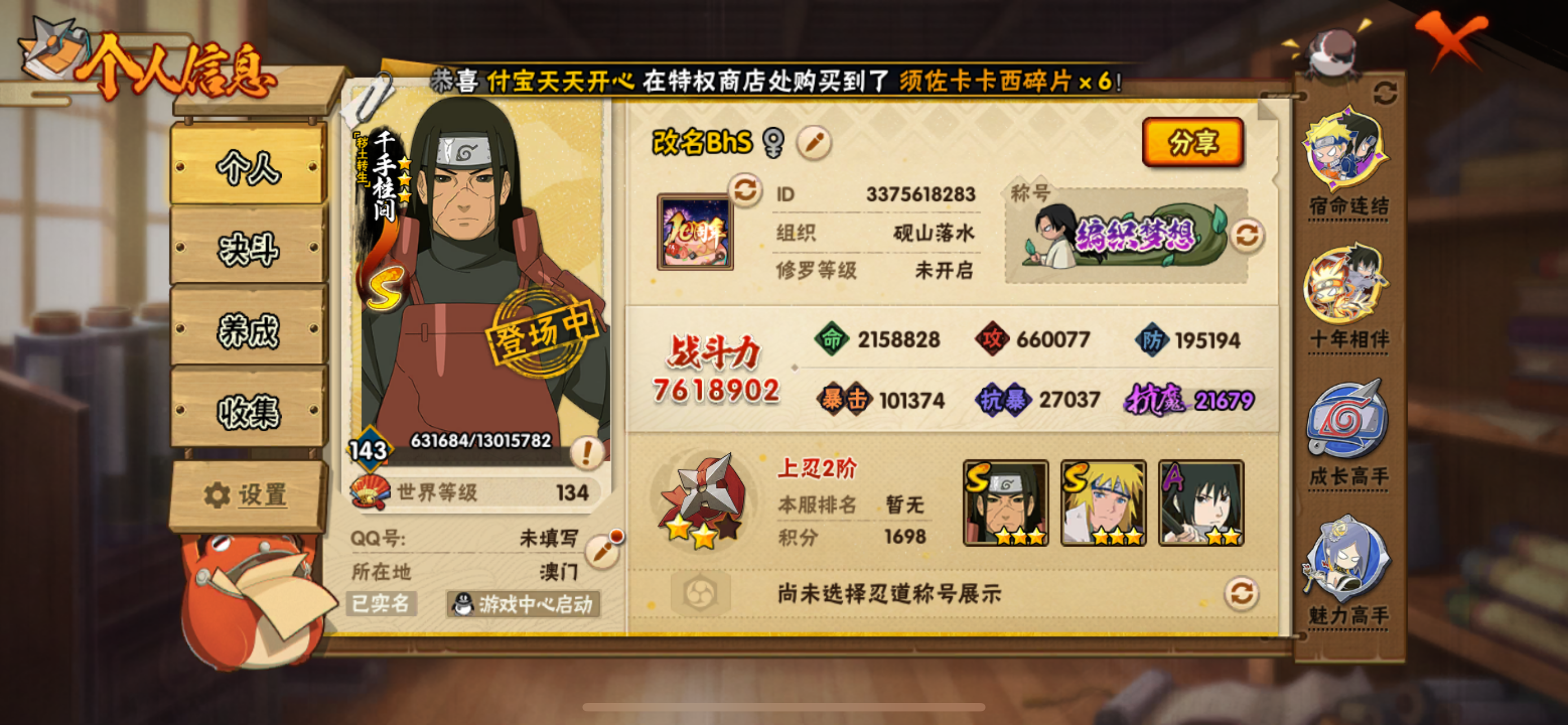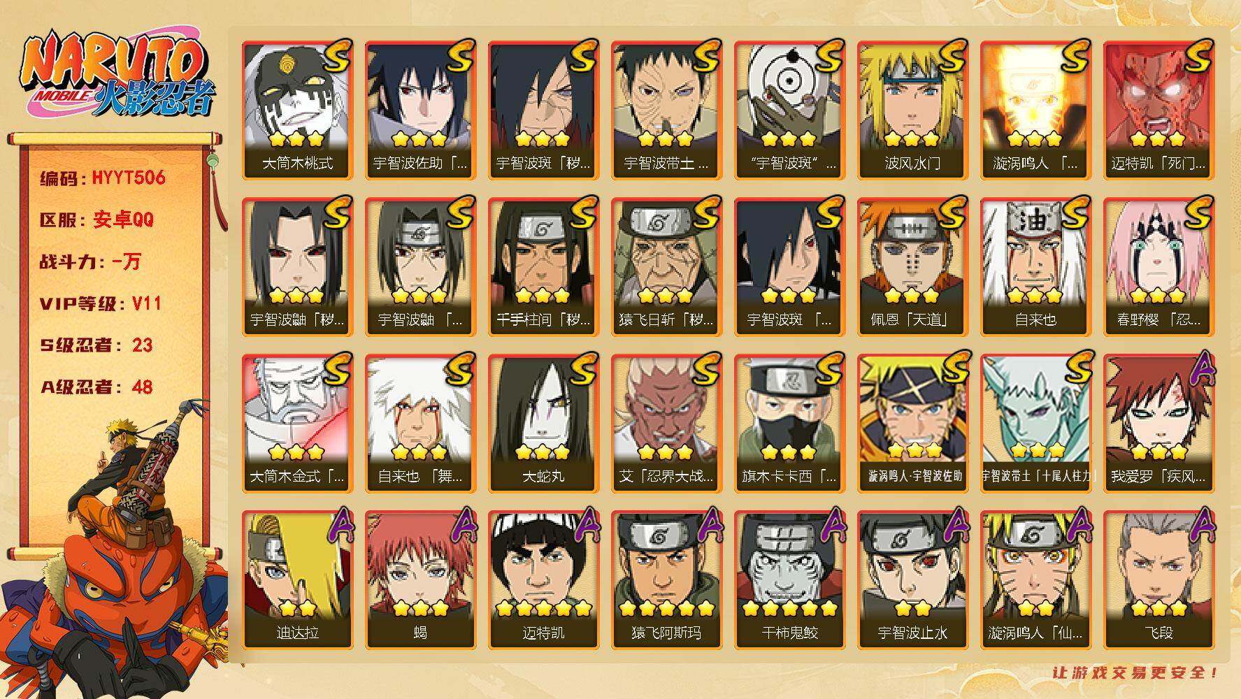 VIP等级V11/S忍数量23/A忍数量48/3星宇智波带土「