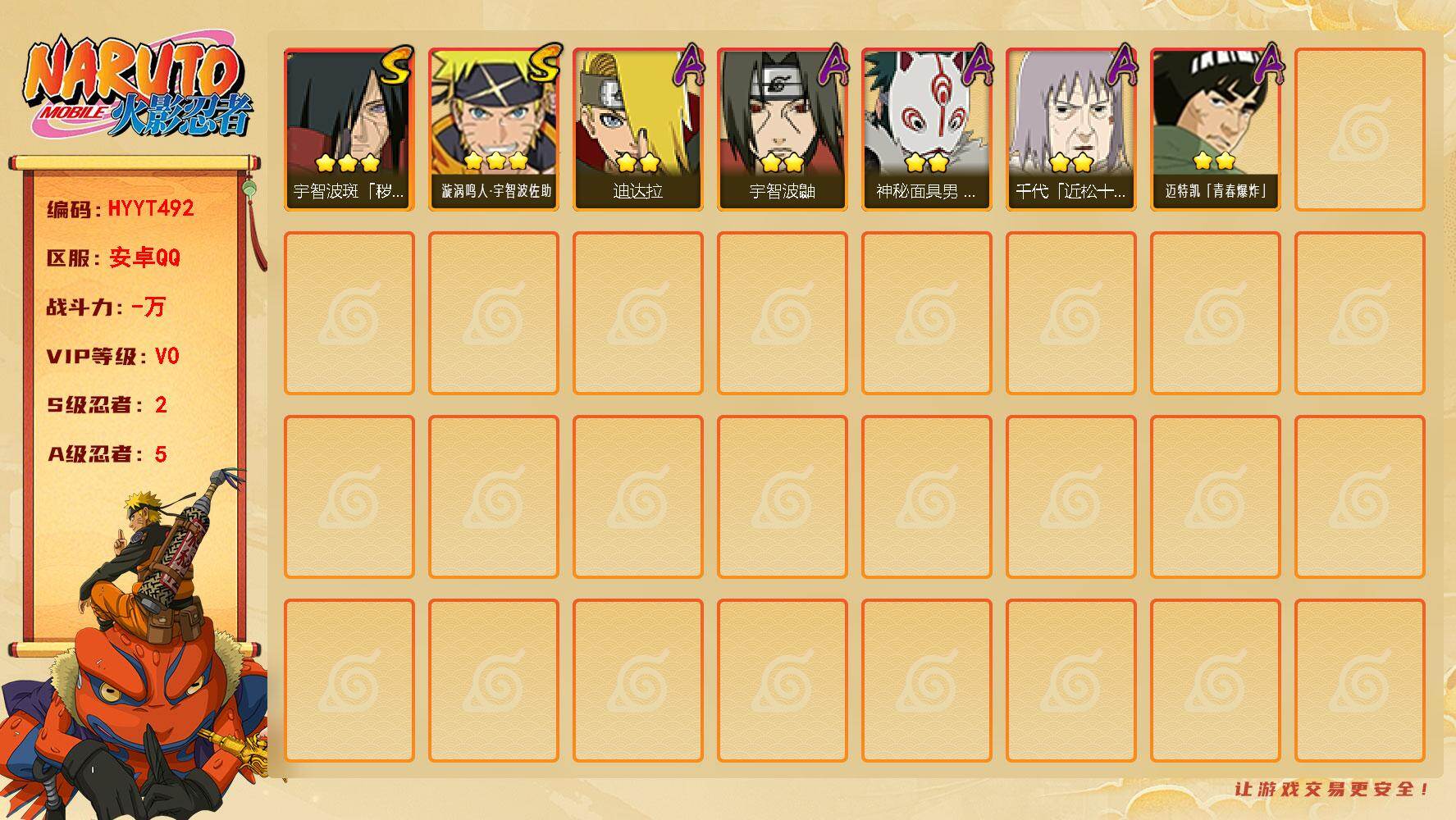 VIP等级V0/S忍数量2/A忍数量5/秽土转生-宇智波斑/迪