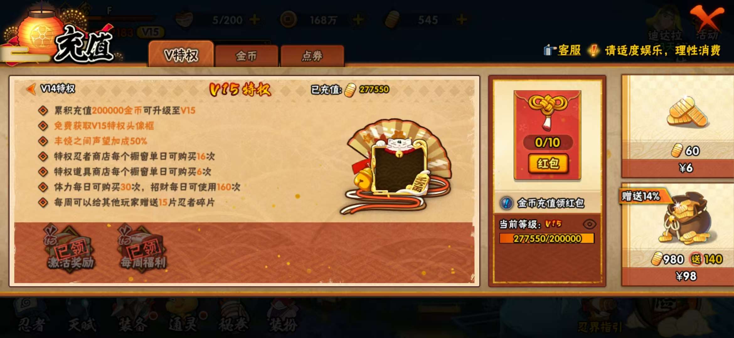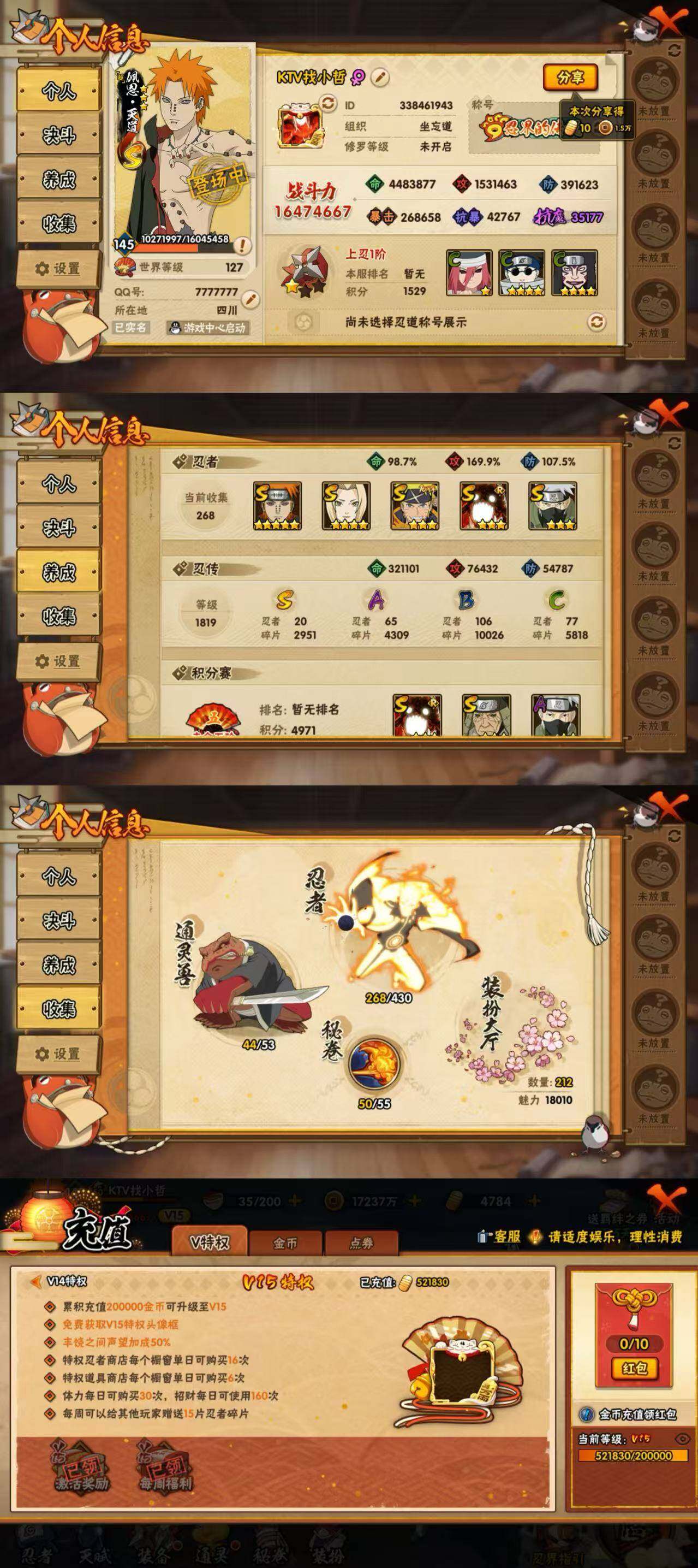 角色等级164 金币5000多 战斗力2100W上 S忍52 A忍83 5星S忍者52 14 段位影级