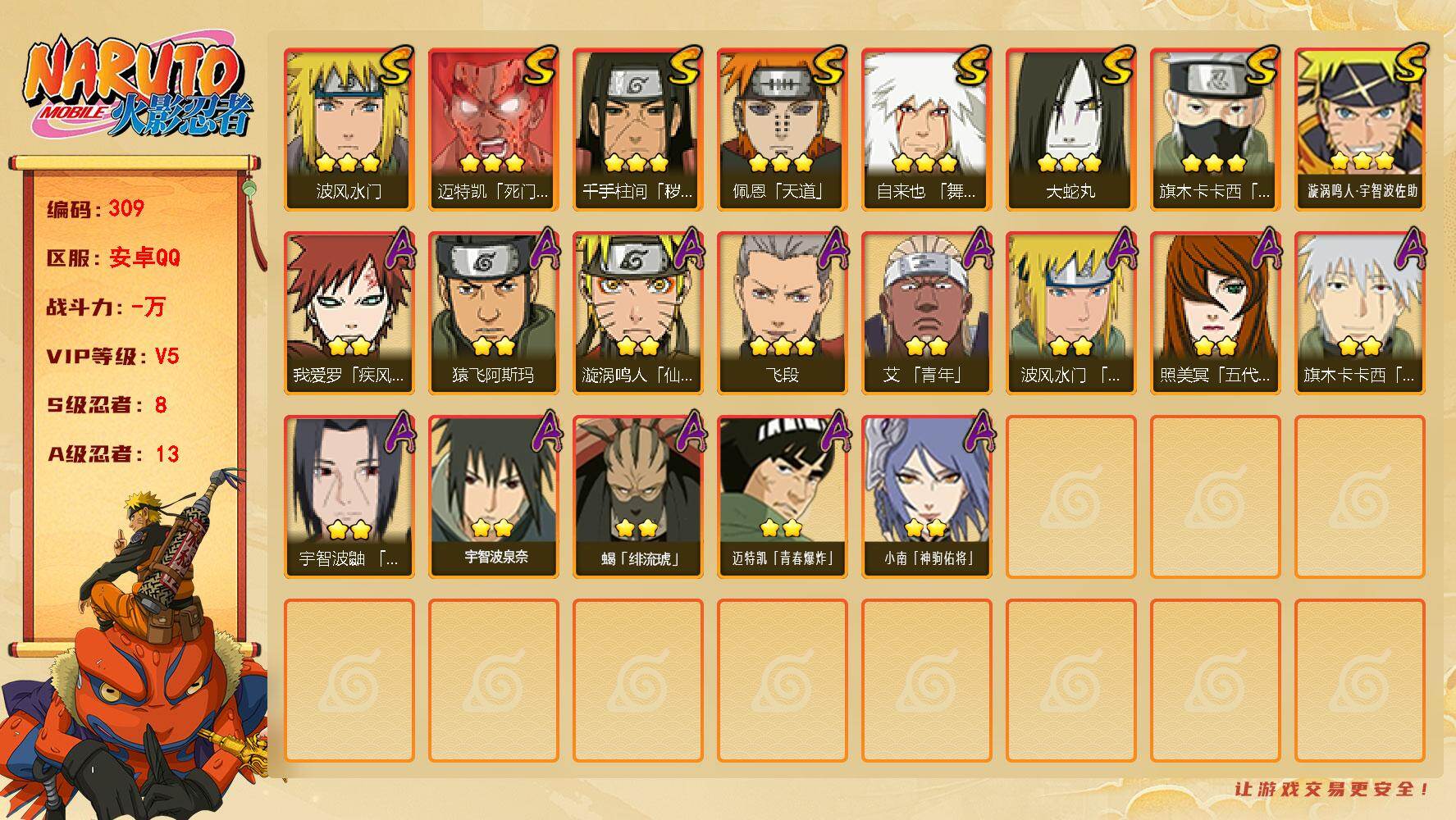 8S忍/22A忍/战力637W/V7/区服4433 【S忍者】宇智波带土「十尾人柱力」,宇智波佐助「漩涡鸣人」,自来也「舞之豪杰」,自来也「传说中的三忍」,宇智波斑「白面具」,
