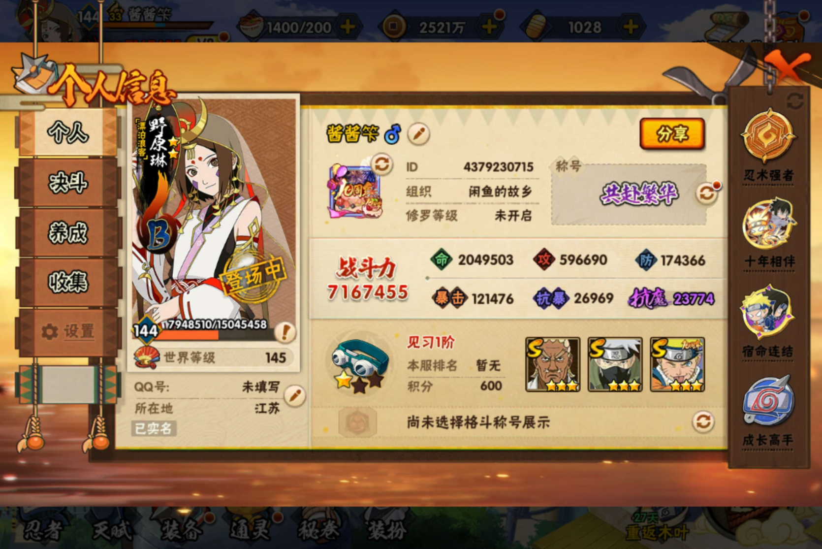角色等级135 金币780 战斗力502w S忍16 A忍25 5星S忍者1 8 段位影级