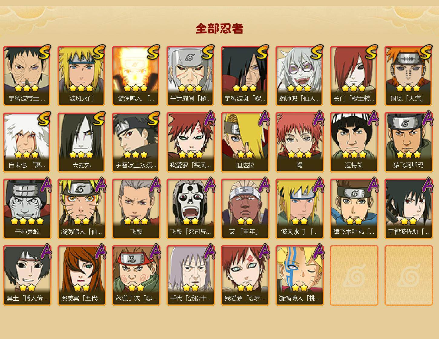 9S级忍者数-30A级忍者数【S级忍者】:千手扉间「秽土转生」(3星),宇智