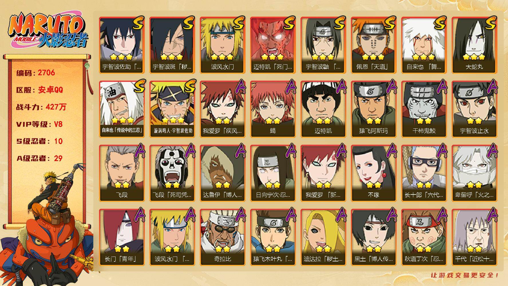 10S忍/27A忍/战力549W/V8/区服4056【S忍者】宇智波佐助「漩涡鸣人」,宇智波止水「须佐能乎」,春野樱「忍界大战」,自来也「舞之豪杰」,旗木卡卡西「须佐能乎」, ,不缘,日向雏田